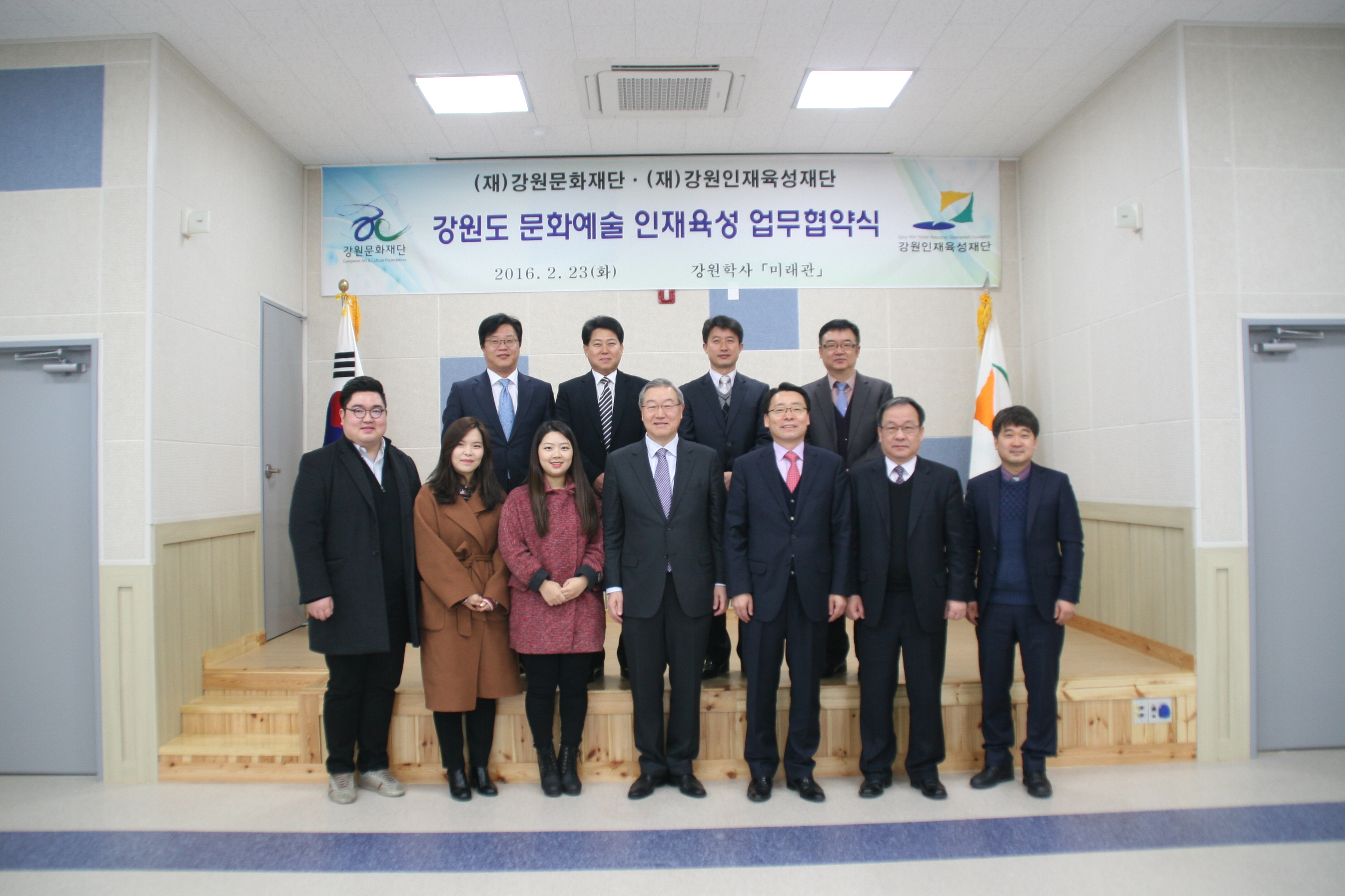 강원학사 미래관에서 2. 23(화), 11시 강원문화재단과 문화예술 인재육성 지원 및 도민 보은 문화공연 공동개최 등을 위한 업무협약을 체결하였다.