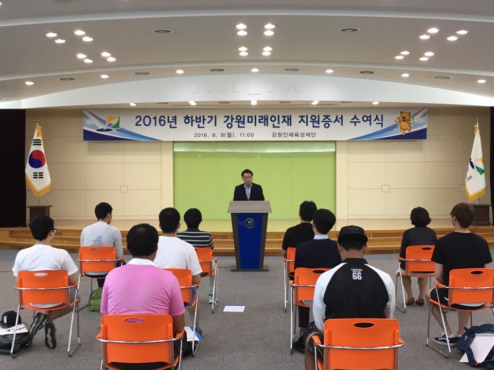 2016년 하반기 미래인재 지원증서 수여식이 8월 8일(월) 오전 11시, 강원도청 별관 4층 회의실에서 김정삼 재단 상임이사님 주관으로 개최되었다.