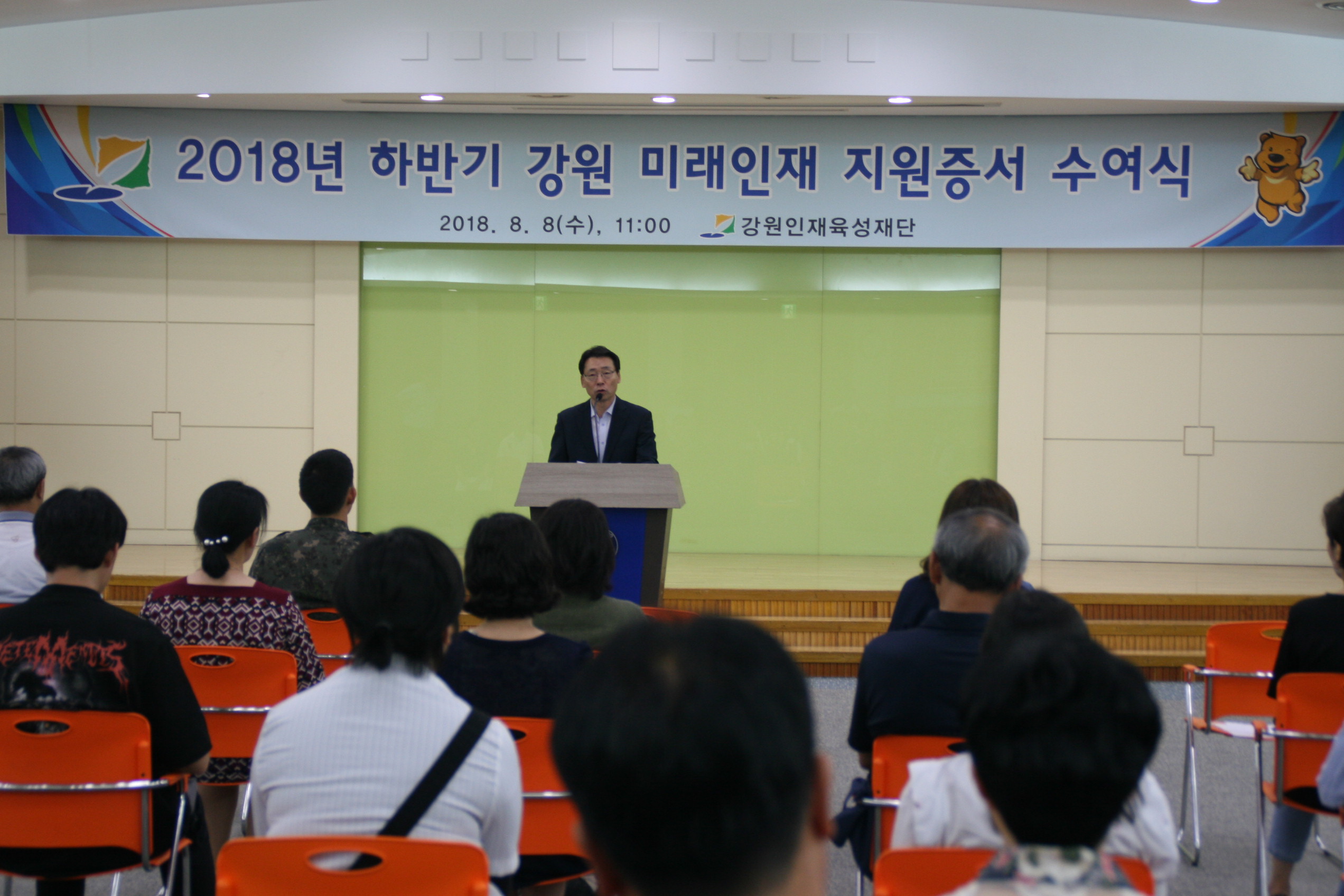 ▶ 2018년 하반기 미래인재 지원증서 수여식에서 인사말을 전하는 김정삼 강원인재육성재단 상임이사님