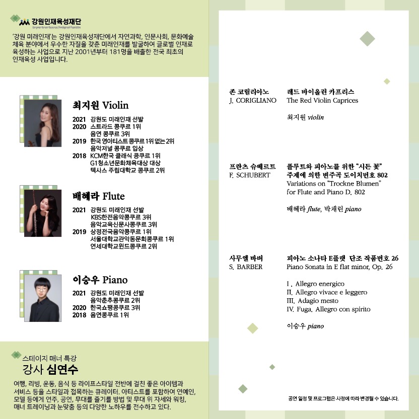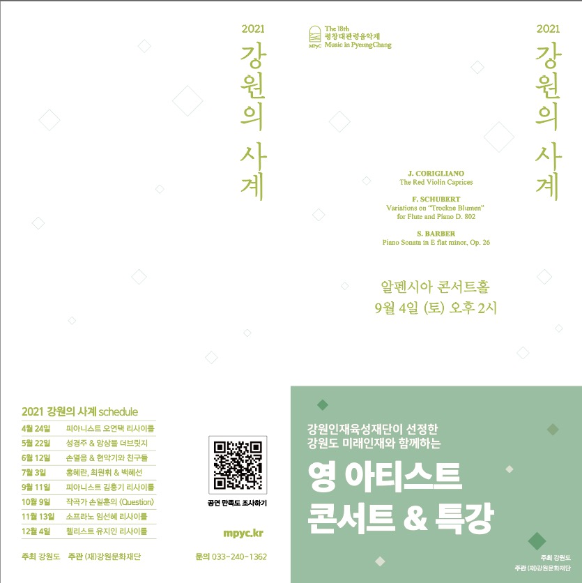 평창대관령국제음악제 '미래인재와 함께하는 영아티스트콘서트 & 특강'일시 : 2021. 9. 4(토) 14:00