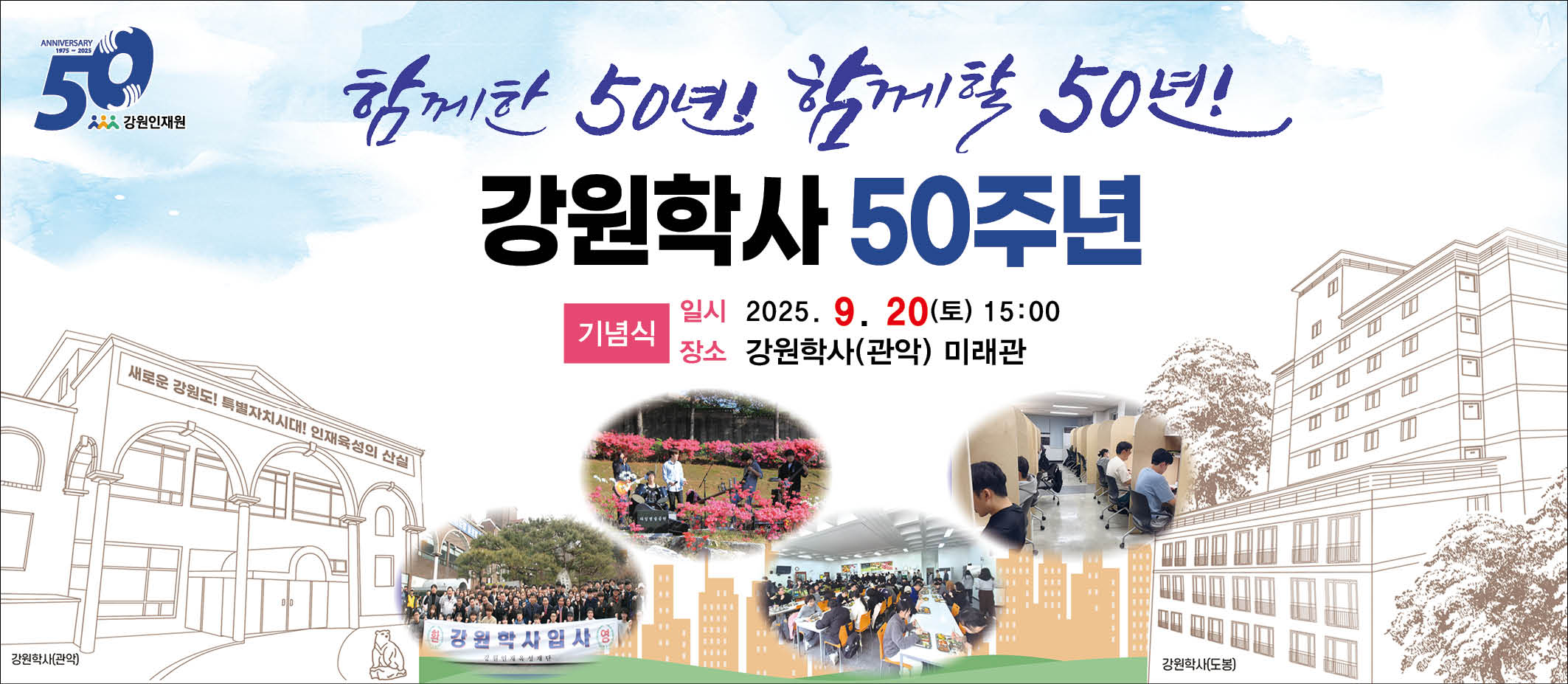 1975년부터 강원 지역인재 양성의 중추적 역할을 담당해 온 강원학사의 50주년 기념식을 개최합니다.