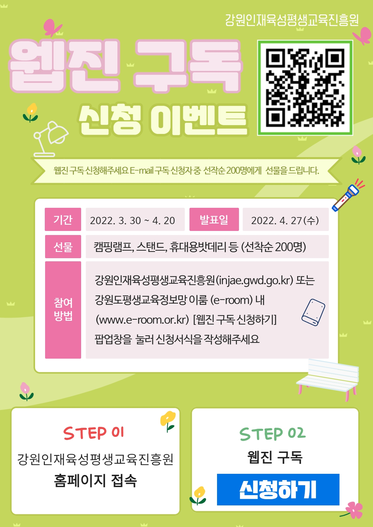 | 1814 | 평생교육 | 웹진 구독 신청 이벤트 | 관리자 | 2022-03-30 | 2,414 | |
