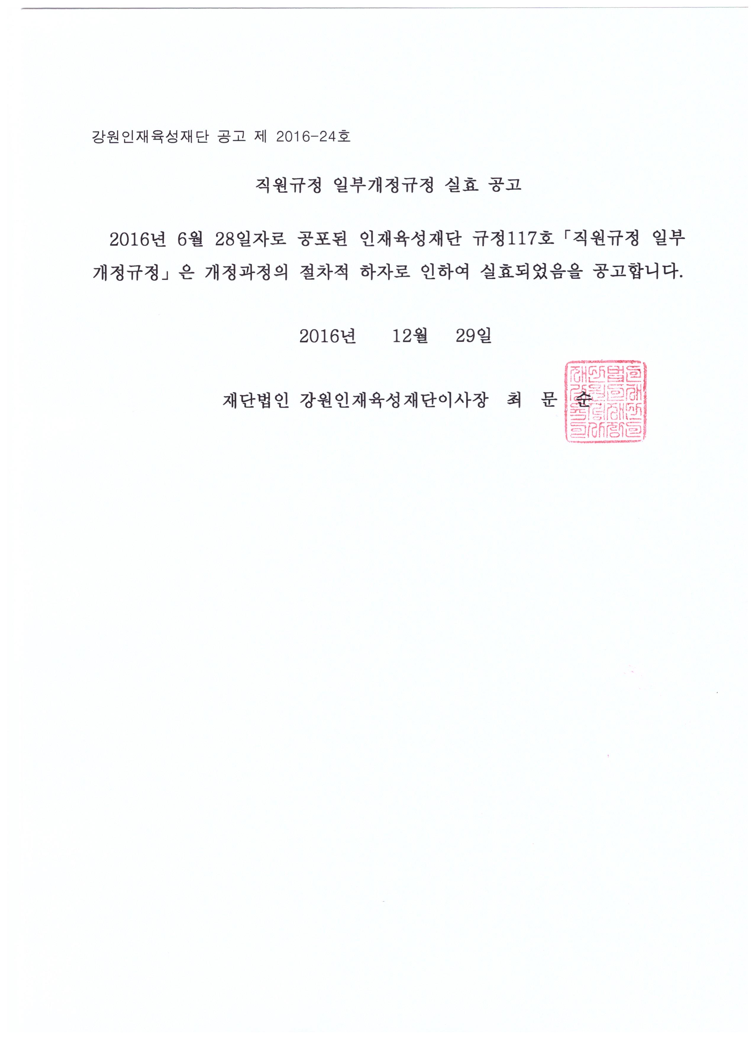 | 1315 | 경영지원 | 직원규정 일부개정규정 실효 공고 | 박종운 | 2016-12-29 | 3,169 | |