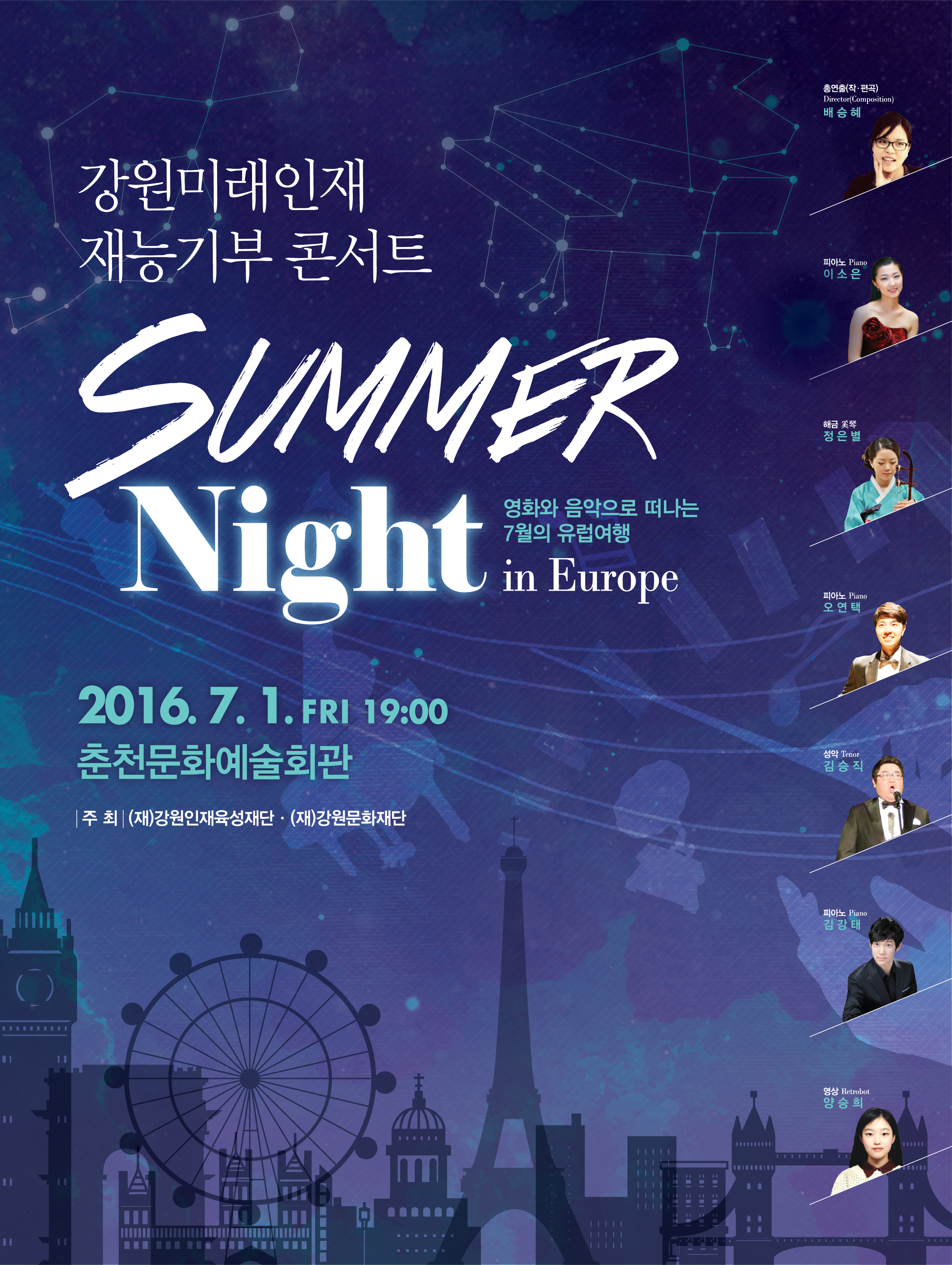 강원인재육성재단과 강원문화재단이 공동 주최하는 이번 콘서트는 ‘영화와 음악으로 떠나는 7월의 유럽여행’을 타이틀로 열려 배승혜(작곡·기획),오연택·이소은·김강태(피아노),김승직(성악),정은별(해금),양승희(영상)씨가 참여한다.