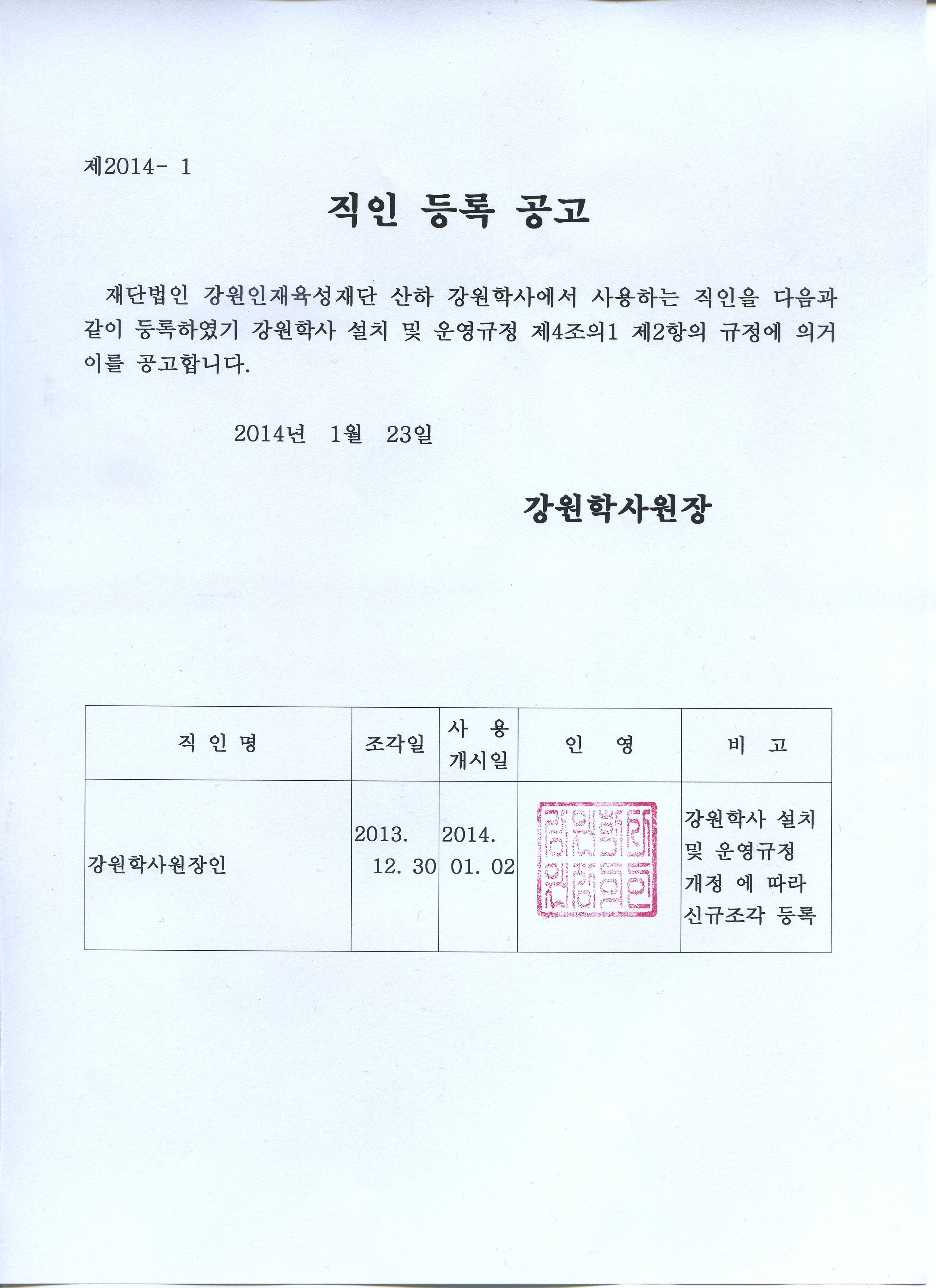 강원학사 설치 및 운영규정 개정으로 강원학사원장제를 시행하에 따라 다음과 같이 직인들 등록하였기 공고합니다.