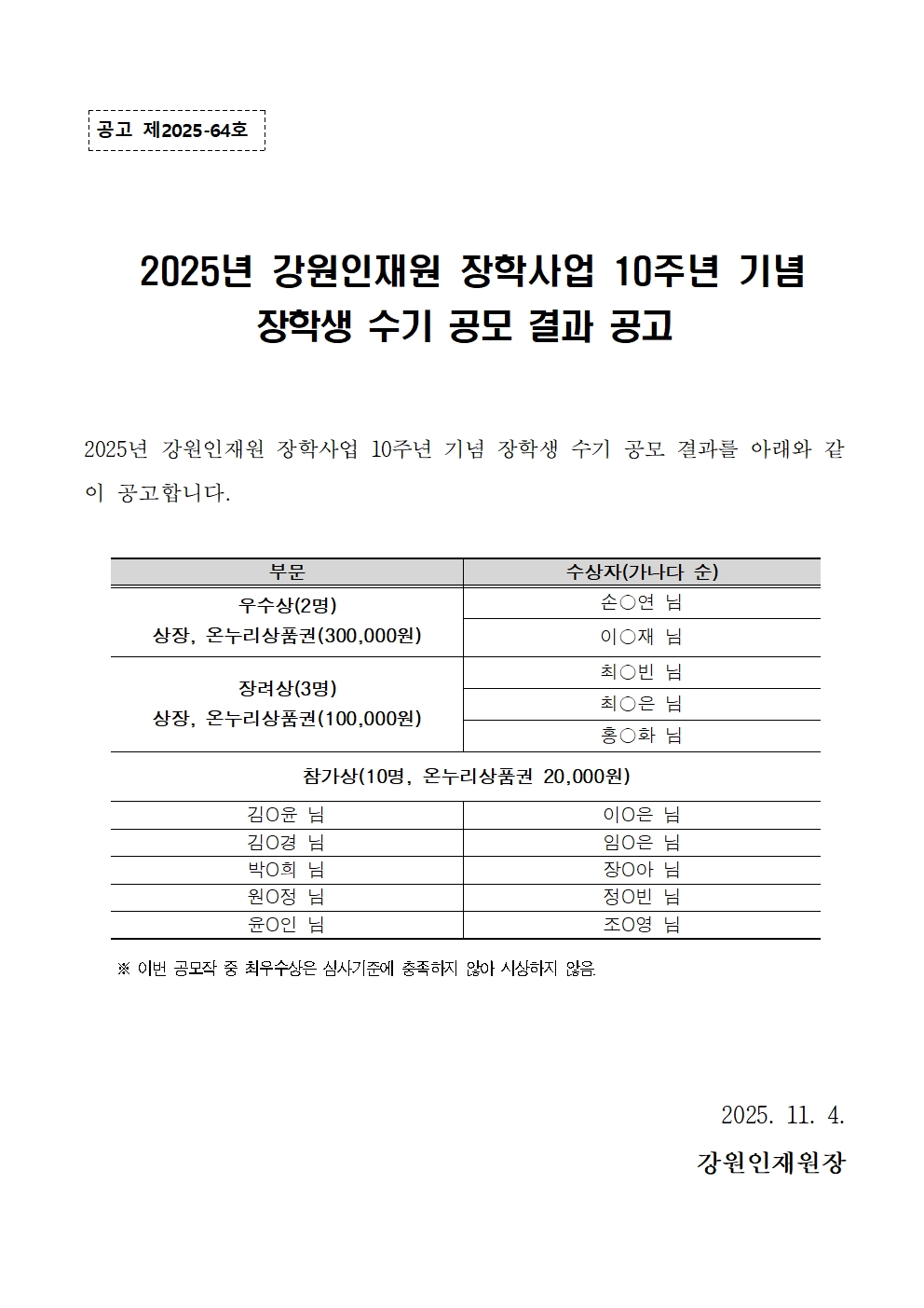 2025년 강원인재원 장학사업 10주년 기념 장학생 수기 공모 결과 공고