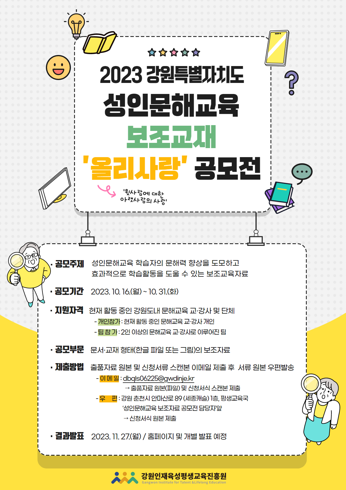 강원인재육성평생교육진흥원에서는 강원특별자치도 문해교·강사를 대상으로 「2023년 강원특별자치도 성인문해교육 보조교재‘올리사랑’공모전」을 아래와 같이 개최하오니, 많은 참여를 부탁드립니다.