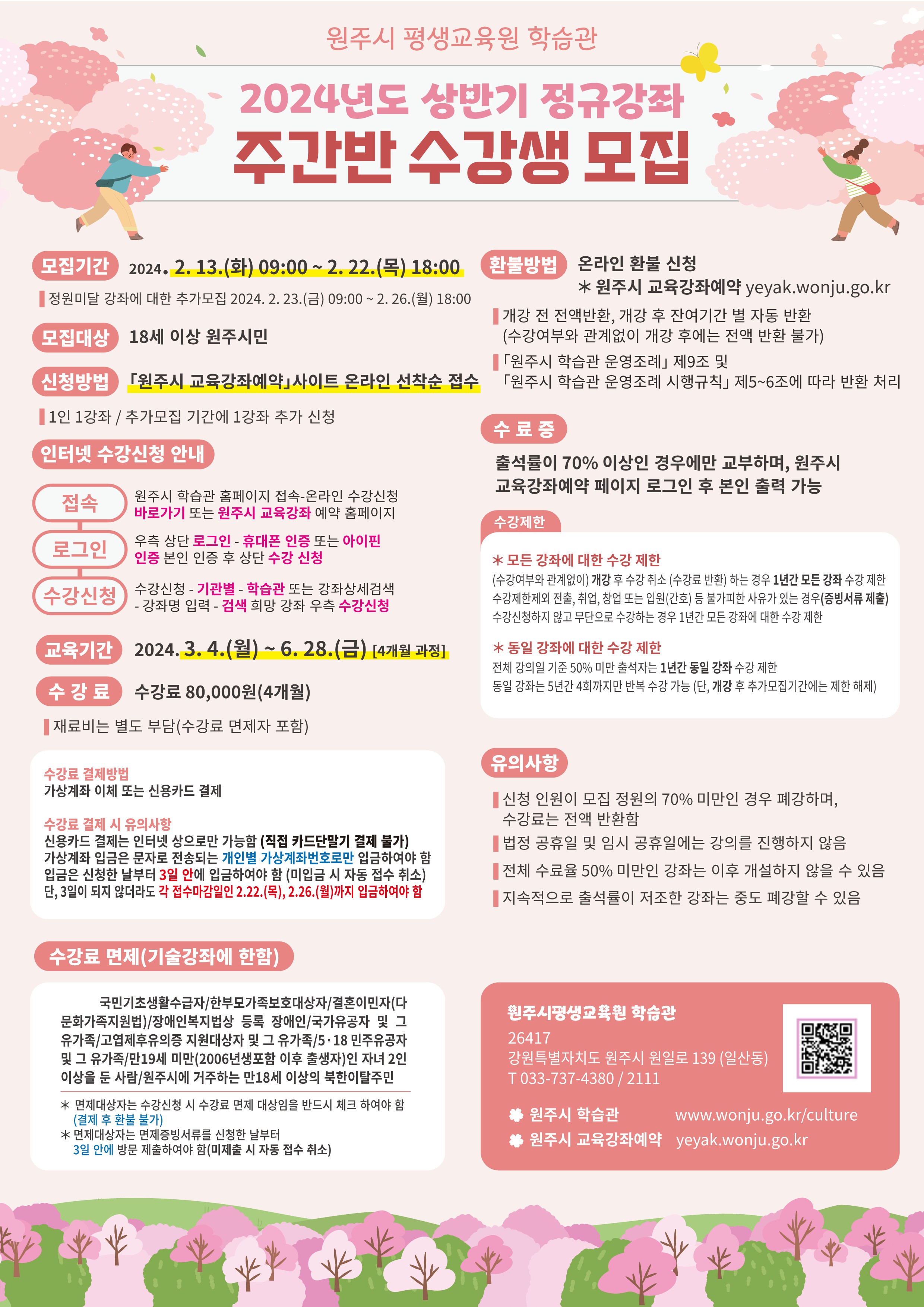 [원주시] 2024년 상반기 학습관 본관 정규강좌(주간반) 수강생 모집