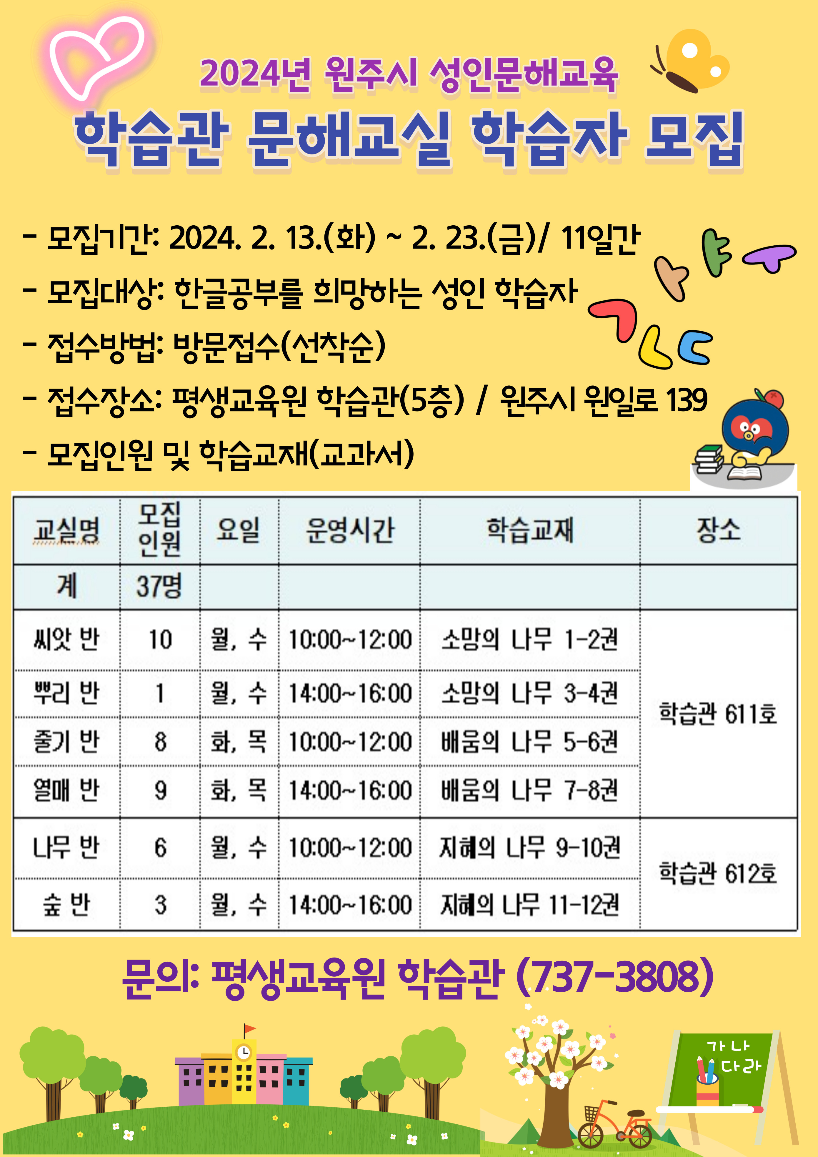○ 사 업 명 : 2024년 원주시 성인문해교육 학습관 문해교실 학습자 모집