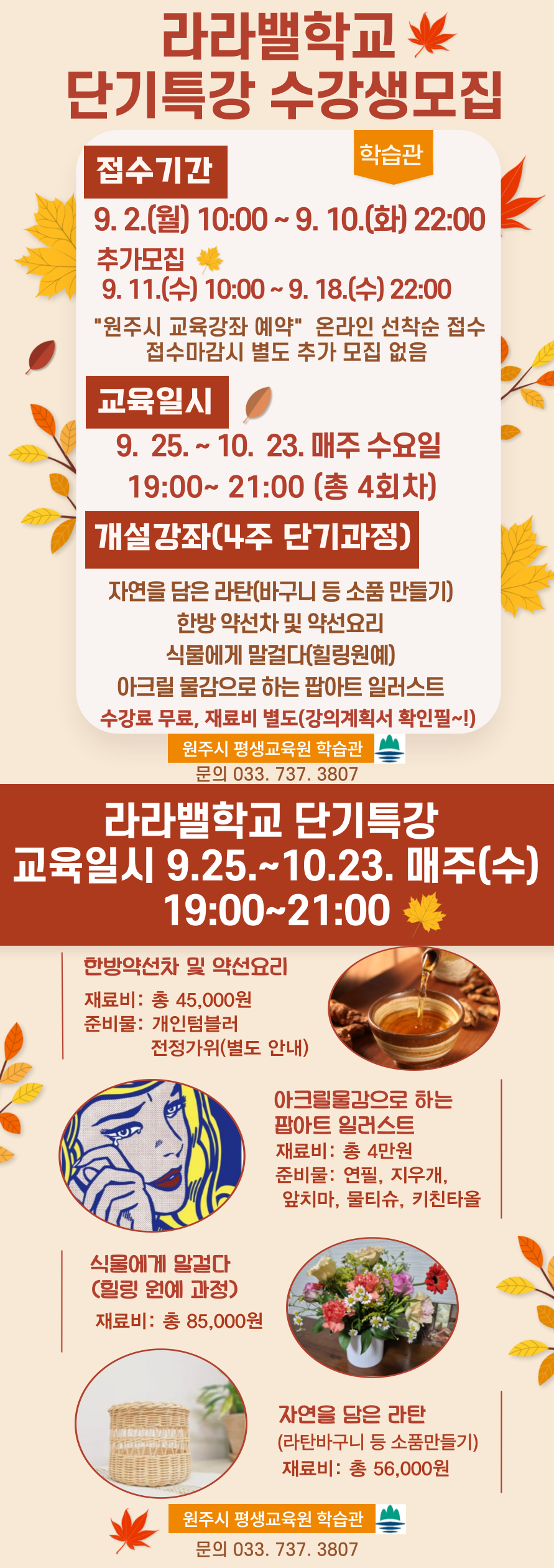 ※ 문의: 원주시 평생교육원 학습관 평생교육팀(☎ 033-737-3807)