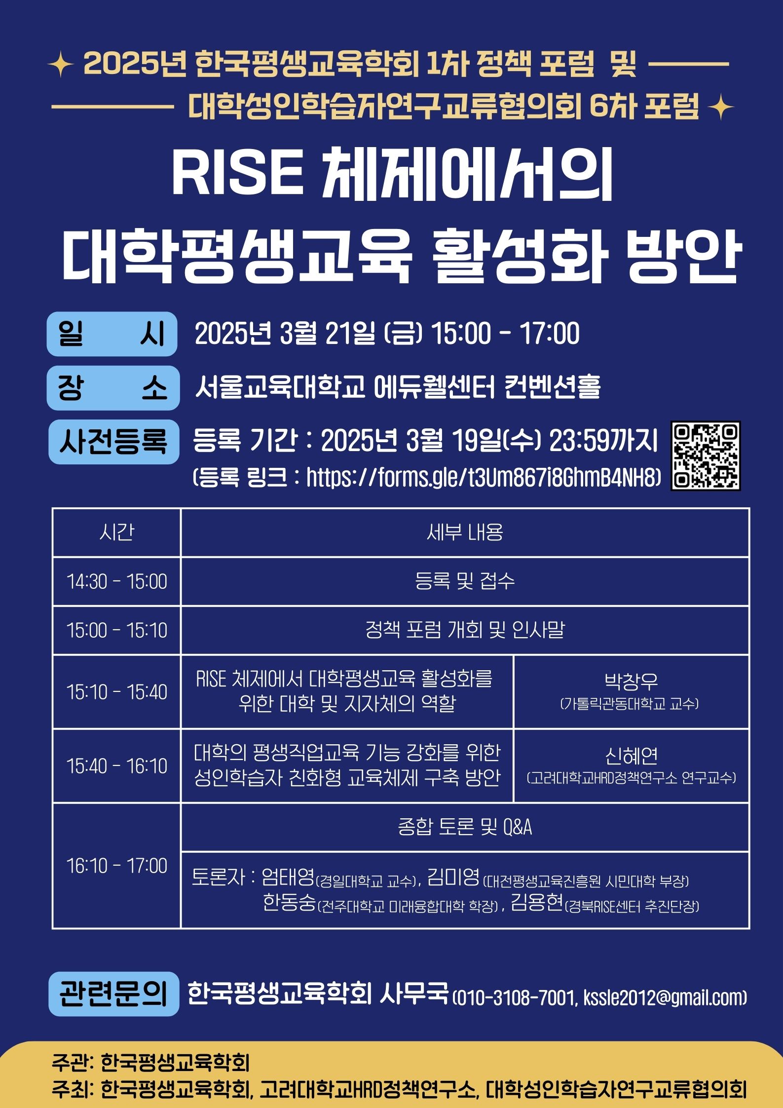 | [한국평생교육학회] "RISE 체제에서의 대학평생교육 활성화 방안" 포럼 개최 안내 | 평생교육부 | 2025-03-18 | 78 | ||