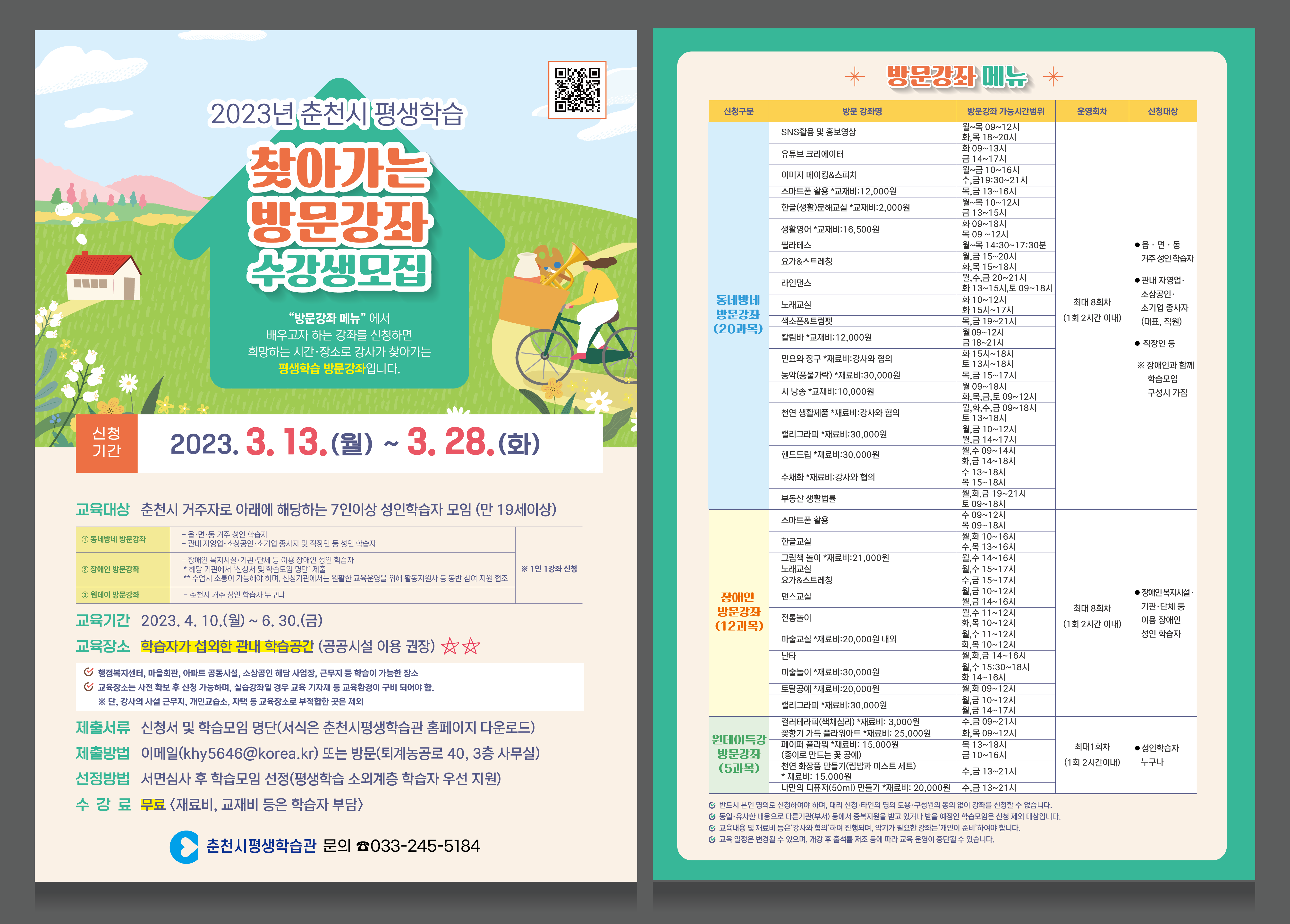 | [춘천시평생학습관] 2023년 춘천시 평생학습 찾아가는 방문강좌 수강생 모집 | 관리자 | 2023-03-10 | 210 | ||