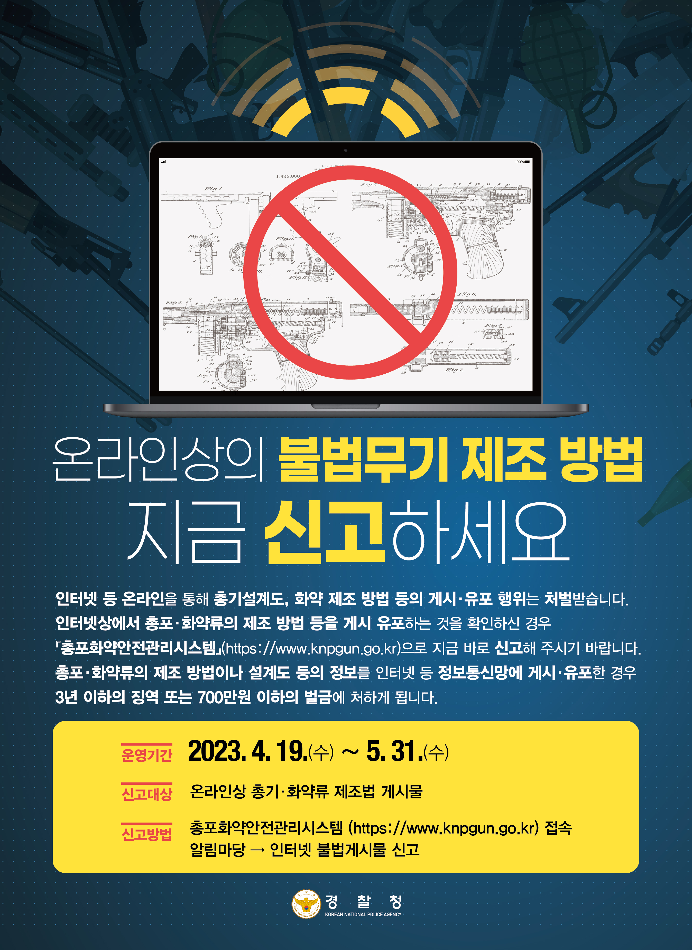 | [강원도경찰청]온라인상의 불법무기 제조방법 지금 신고하세요 | 경영지원팀 | 2023-05-23 | 231 | ||