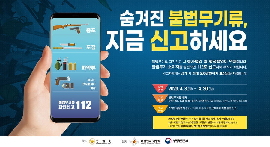 | [강원도경찰청] 4월 불법무기 자진 신고 기간 운영 | 경영지원팀 | 2023-04-11 | 253 | ||