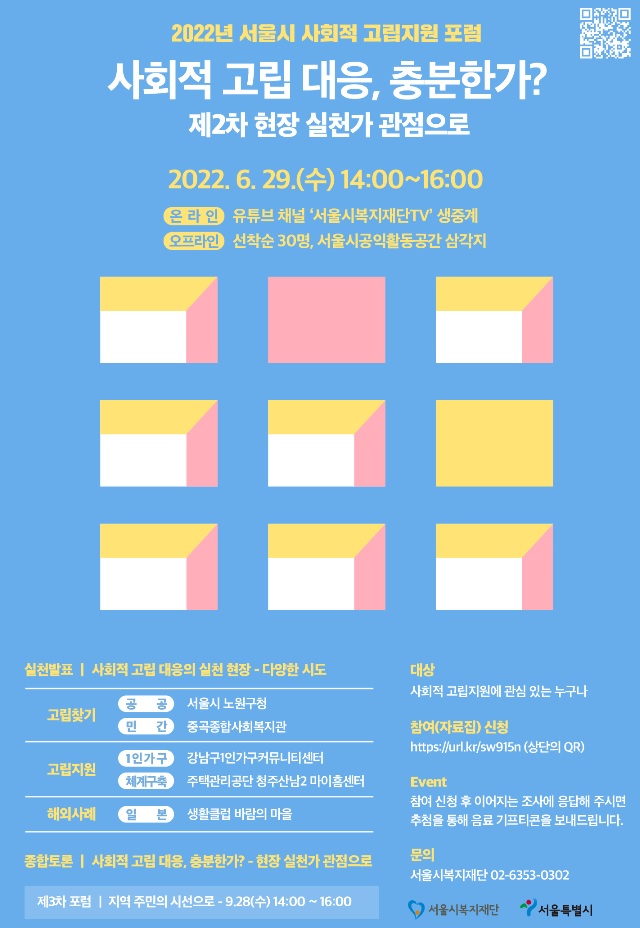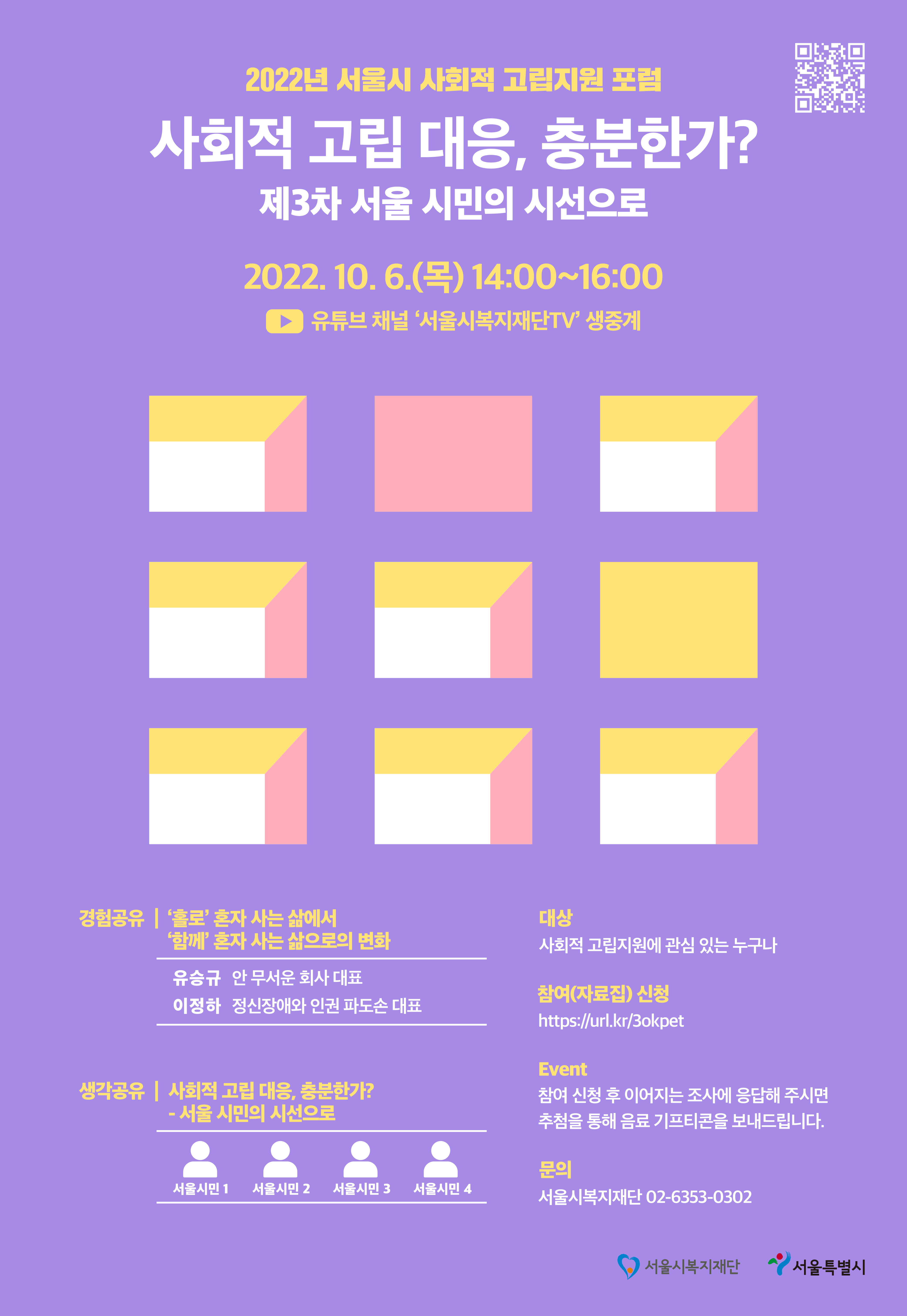 | [서울시복지재단] 2022년 서울시 사회적 고립지원 포럼 | 경영지원팀 | 2022-09-23 | 159 | ||