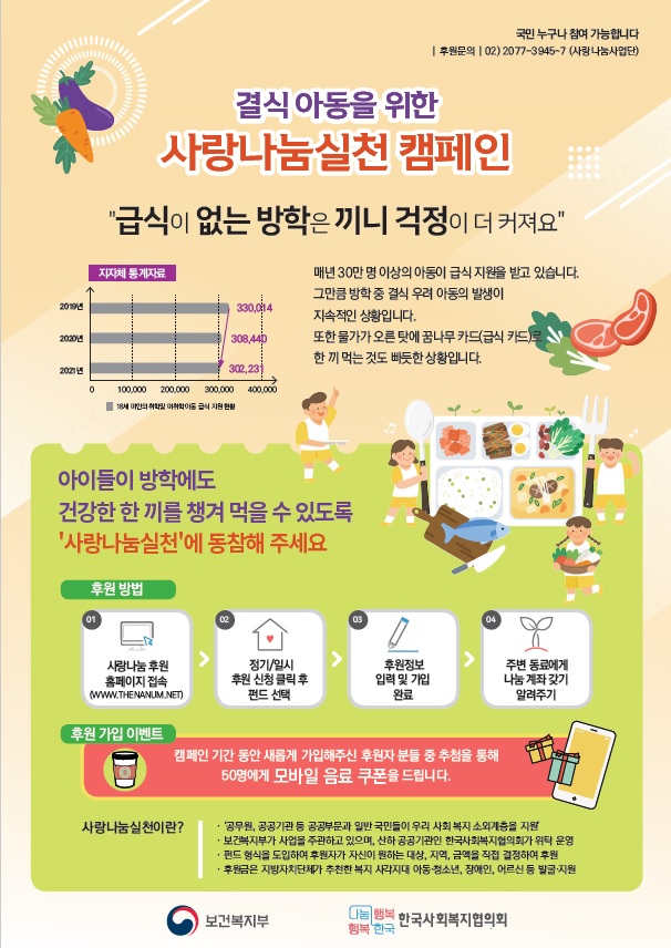 | [한국사회복지협의회] 2022년 사랑나눔실천 결식아동 돕기 캠페인 | 경영지원팀 | 2022-08-09 | 158 | ||