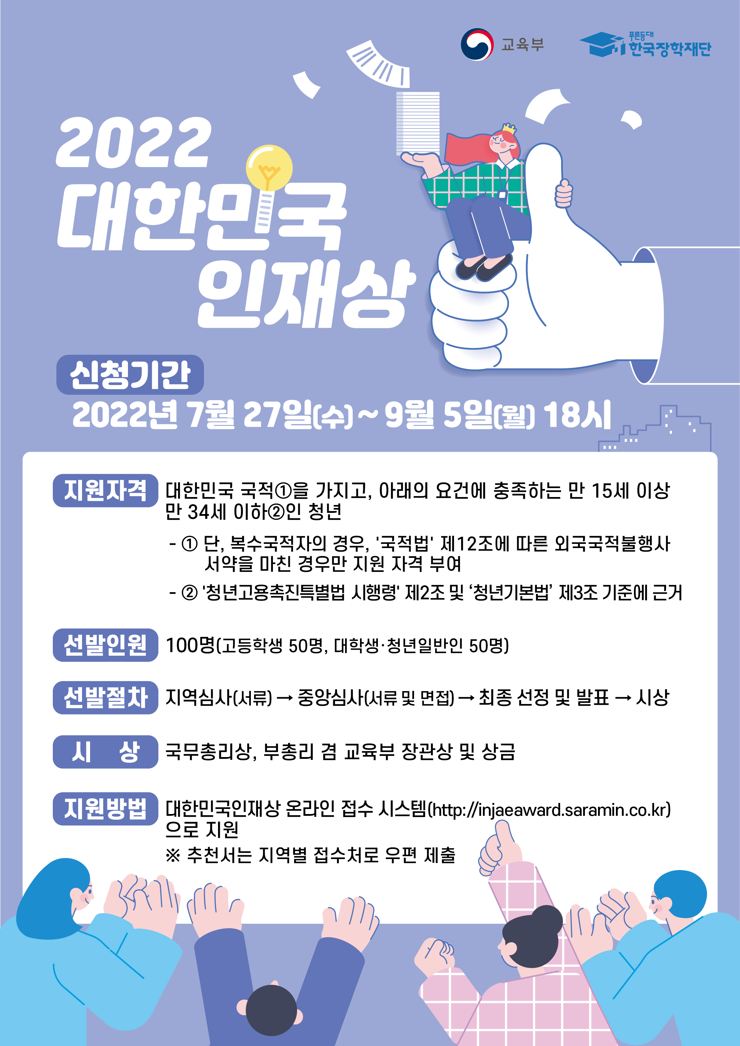 | [교육부] 2022 대한민국 인재상 접수기간 연장 | 경영지원팀 | 2022-08-26 | 152 | ||
