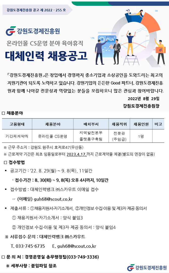 | [강원도경제진흥원] 대체인력 채용공고 | 경영지원팀 | 2022-08-29 | 170 | ||