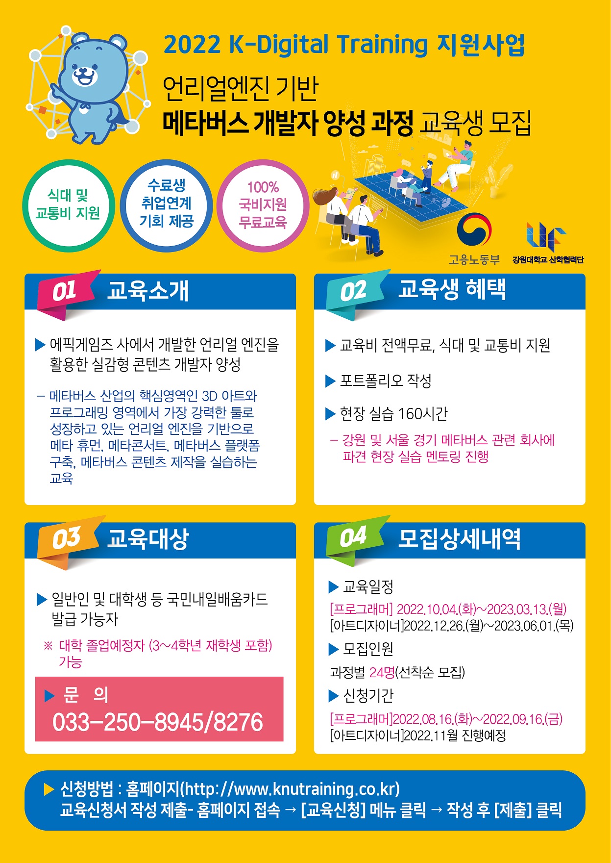 | [강원대학교 산학협력단] 메타버스 개발자 양성과정 교육생 모집(8.16.~9.16.) | 경영지원팀 | 2022-09-07 | 194 | ||
