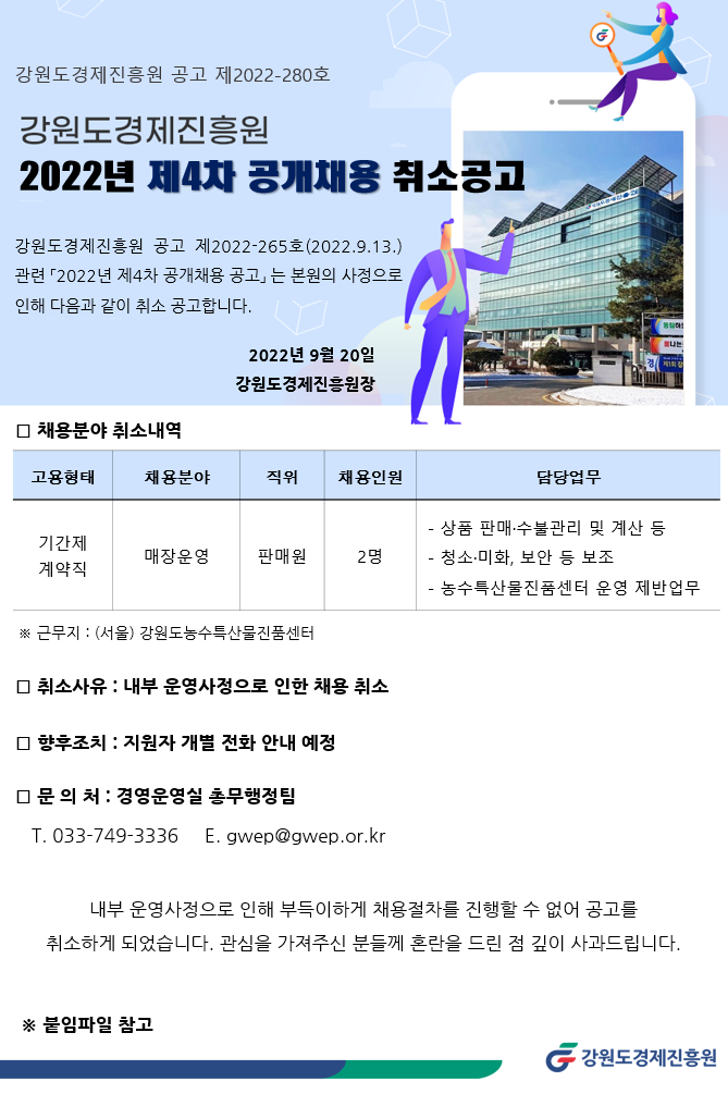 | [강원도경제진흥원]2022년 제4차 공개채용 취소공고 | 관리자 | 2022-09-21 | 155 | ||