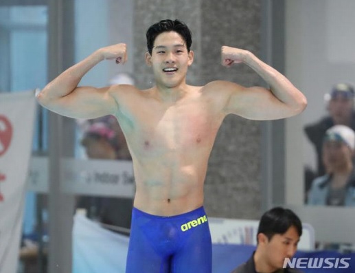 김영범(강원체고)이 18일 전남 목포시 목포실내수영장에서 열린 제104회 전국체육대회 수영 남자 고등부 접영 100m 결선경기에서 51.97초로 한국신기록을 세우고 기념촬영을 하고 있다. 해당 기록은 다음 경기 남자 일반부 양재훈(강원)이 51.85로 다시 기록을 경신했다.