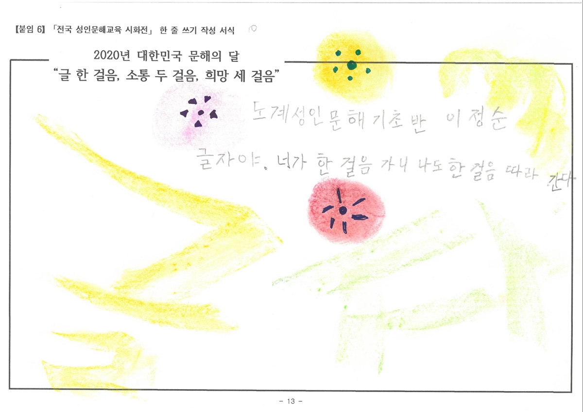 도계읍 문해교육반에서 5년 정도 공부하였습니다. 글을 배우니 즐겁고 글자를 알아가는 기쁨을 글자로 표현하였습니다.