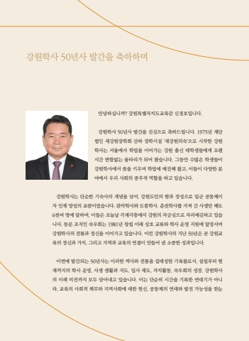 %uac15%uc6d0%ud559%uc0ac 50%ub144%uc0ac %ubc1c%uac04%uc744 %ucd95%ud558%ud558%uba70%uc548%ub155%ud558%uc2ed%ub2c8%uae4c? %uac15%uc6d0%ud2b9%ubcc4%uc790%uce58%ub3c4%uad50%uc721%uac10 %uc2e0%uacbd%ud638%uc785%ub2c8%ub2e4.%uac15%uc6d0%ud559%uc0ac 50%ub144%uc0ac %ubc1c%uac04%uc744 %uc9c4%uc2ec%uc73c%ub85c %ucd95%ud558%ub4dc%ub9bd%ub2c8%ub2e4. 1975%ub144 %uc7ac%ub2e8%ubc95%uc778 %uc0c8%uac15%uc6d0%uc7a5%ud559%ud68c %uc0b0%ud558 %uc7a5%ud559%uc2dc%uc124 %u2018%uc0c8%uac15%uc6d0%uc758%uc219%u2019%uc73c%ub85c %uc2dc%uc791%ud55c %uac15%uc6d0%ud559%uc0ac%ub294 %uc11c%uc6b8%uc5d0%uc11c %ud559%uc5c5%uc744 %uc774%uc5b4%uac00%ub294 %uac15%uc6d0 %ucd9c%uc2e0 %ub300%ud559%uc0dd%ub4e4%uc5d0%uac8c %uc624%ub79c %uc2dc%uac04 %ubcc0%ud568%uc5c6%ub294 %uc6b8%ud0c0%ub9ac%uac00 %ub418%uc5b4 %uc654%uc2b5%ub2c8%ub2e4. %uadf8%ub3d9%uc548 %uc218%ub9ce%uc740 %ud559%uc0dd%ub4e4%uc774 %uac15%uc6d0%ud559%uc0ac%uc5d0%uc11c %uafc8%uc744 %ud0a4%uc6b0%uba70 %ud559%uc5c5%uc5d0 %ub9e4%uc9c4%ud574 %uc654%uace0, %uc774%ub4e4%uc774 %ub2e4%uc591%ud55c %ubd84%uc57c%uc5d0%uc11c %uc6b0%ub9ac %uc0ac%ud68c%uc758 %uc911%ucd94%uc801 %uc5ed%ud560%uc744 %ud558%uace0 %uc788%uc2b5%ub2c8%ub2e4.%uac15%uc6d0%ud559%uc0ac%ub294 %ub2e8%uc21c%ud55c %uae30%uc219%uc0ac%uc758 %uac1c%ub150%uc744 %ub118%uc5b4, %uac15%uc6d0%ub3c4%ubbfc%uc758 %ub540%uacfc %uc815%uc131%uc73c%ub85c %uc77c%uad70 %uacf5%ub3d9%uccb4%uc774%uc790 %uc778%uc7ac %uc591%uc131%uc758 %uc694%ub78c%uc774%uc5c8%uc2b5%ub2c8%ub2e4. %uad00%uc545%ud559%uc0ac%uc640 %ub3c4%ubd09%ud559%uc0ac, %ucd98%ucc9c%ud559%uc0ac%ub97c %uac70%uccd0 %uac04 %uc0ac%uc0dd%ub9cc %ud574%ub3c4 6%ucc9c%uc5ec %uba85%uc5d0 %ub2ec%ud558%uba70, %uc774%ub4e4%uc740 %uc624%ub298%ub0a0 %uac01%uacc4%uac01%uce35%uc5d0%uc11c %uac15%uc6d0%uc758 %uc790%uae0d%uc2ec%uc73c%ub85c %uc790%ub9ac%ub9e4%uae40%ud558%uace0 %uc788%uc2b5%ub2c8%ub2e4. %ub3d9%ubb38 %uc870%uc9c1%uc778 %uc219%uc6b0%ud68c%ub294 1981%ub144 %ucc3d%ub9bd %uc774%ub798 %uc0c1%ud638 %uad50%ub958%uc640 %ud559%uc0ac %uc6b4%uc601 %uc9c0%uc6d0%uc5d0 %uc55e%uc7a5%uc11c%uba70 %uac15%uc6d0%ud559%uc0ac%uc758 %uc804%ud1b5%uacfc %uc815%uc2e0%uc744 %uc774%uc5b4%uac00%uace0 %uc788%uc2b5%ub2c8%ub2e4. %uc774%ub7f0 %uac15%uc6d0%ud559%uc0ac%uc758 %uc9c0%ub09c 50%ub144%uc740 %uace7 %uac15%uc6d0%uad50%uc721%uc758 %uc815%uc2e0%uacfc %uac00%uce58, %uadf8%ub9ac%uace0 %uc9c0%uc5ed%uacfc %uad50%uc721%uc758 %uc5f0%uacb0%uc774 %ub9cc%ub4e4%uc5b4 %ub0b8 %uc18c%uc911%ud55c %uc131%uacfc%uc785%ub2c8%ub2e4.%uc774%ubc88%uc5d0 %ubc1c%uac04%ub418%ub294 50%ub144%uc0ac%ub294 %uc774%ub7ec%ud55c %uc5ed%uc0ac%uc640 %uc804%ud1b5%uc744 %uc9d1%ub300%uc131%ud55c %uae30%ub85d%ubb3c%ub85c%uc11c, %uc124%ub9bd%ubd80%ud130 %ud604%uc7ac%uae4c%uc9c0%uc758 %ud559%uc0ac %uc6b4%uc601, %uc0ac%uc0dd %uc0dd%ud65c%uacfc %uc9c0%ub3c4, %uc785%uc0ac %uc81c%ub3c4, %uc790%uce58%ud65c%ub3d9, %uc219%uc6b0%ud68c%uc758 %uc131%uc7a5, %uac15%uc6d0%ud559%uc0ac%uc758 %ubbf8%ub798 %ube44%uc804%uae4c%uc9c0 %ubaa8%ub450 %ub2f4%uc544%ub0b4%uace0 %uc788%uc2b5%ub2c8%ub2e4. %uc774%ub294 %ub2e8%uc21c%ud788 %uc2dc%uac04%uc744 %uae30%ub85d%ud55c %uc5f0%ub300%uae30%uac00 %uc544%ub2c8%ub77c, %uad50%uc721%uc758 %uc0ac%ud68c%uc801 %ucc45%ubb34%uc640 %uc9c0%uc5ed%uc0ac%ud68c%uc5d0 %ub300%ud55c %ud5cc%uc2e0, %uacf5%ub3d9%uccb4%uc758 %uc5f0%ub300%uc640 %ubc1c%uc804 %uac00%ub2a5%uc131%uc744 %ud55c%ub208