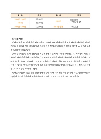 1992%ub144~1993%ub14430,000%uc6d02013%ub144200,000%uc6d0- %ubc18%ud658 %uaddc%uc815 %uc0ad%uc81c1994%ub14450,000%uc6d01995%ub144~1996%ub14470,000%uc6d02014%ub144~%ud604%uc7ac 100,000%uc6d0(2) %ud638%uc2e4 %ubc30%uc815%uc785%uc0ac %ub4f1%ub85d%uc774 %uc644%ub8cc%ub418%uba74 %ucd9c%uc2e0 %uc9c0%uc5ed %u302e %ud559%uad50 %u302e %ud559%ub144%ubcc4 %uade0%ud615 %uc548%ubc30 %uc6d0%uce59%uc5d0 %uc758%uac70 %uc0ac%uc2e4%uc744 %ubc30%uc815%ud558%uc5ec %uc785%uc0ac%uc2dd %uc804%uae4c%uc9c0 %uacf5%uace0%ud55c%ub2e4. %uc77c%ub2e8 %ubc30%uc815%ub41c %ubc29%uc740 %uc0ac%uc0dd%ub4e4 %uac04%uc758 %ub3d9%uc758%uc5d0 %uc758%ud558%ub354%ub77c%ub3c4 %uc784%uc758%ub85c %ubcc0%uacbd%ud560 %uc218 %uc5c6%ub3c4%ub85d %uc0ac%uc0dd %uc218%uce59%uc73c%ub85c %uba85%uc2dc%ud558%uace0 %uc788%ub2e4.2003%ub144%ubd80%ud130%ub294 %ud55c %ubc88 %ubc30%uc815%ud55c %ubc29%uc740 %uac00%uae09%uc801 %uc878%uc5c5 %ub610%ub294 %ud1f4%uc0ac %uc2dc%uae4c%uc9c0 %uc7ac%ubc30%uc815%uc744 %ucd5c%uc18c%ud654%ud558%uc600%ub2e4. %uc774%ub294 %uc0ac%uc0dd%ub4e4%uc774 %u2018%ub098%uc758 %uc548%uc2dd%ucc98%u2019%ub77c%ub294 %uc560%ucc29%uc2ec%uc744 %uac16%uace0 %uc548%uc815%ub418%uace0 %ud3b8%uc548%ud55c %uc0dd%ud65c%uc744 %ud568%uacfc %ub3d9%uc2dc %uccad%uacb0%ud558%uac8c %uad00%ub9ac%ud558%uace0 %ubcf4%uc874%ud560 %uc218 %uc788%ub3c4%ub85d %uc720%ub3c4%ud574 %uc900%ub2e4. %uadf8%ub7ec%ub098 %ud55c %ud638%uc2e4%uc5d0%uc11c%ub9cc %uac70%uc8fc%ud560 %uacbd%uc6b0, %ub2e4%ub978 %ud638%uc2e4%uc758 %uc0ac%uc0dd%ub4e4%ud558%uace0 %uad50%ub958%uac00 %uc5c6%uc5b4%uc9c8 %uc218 %uc788%ub2e4%ub294 %ubc18%ub300 %uc758%uacac%ub3c4 %uc788%uc5c8%ub2e4. %ub610%ud55c %ucd9c%uc2e0 %uc9c0%uc5ed%uacfc %ud559%uad50%ub85c %ubc30%uc815%uc744 %ud558%ub2e4 %ubcf4%ub2c8 %uc720%uc0ac %ud559%uacfc%uc640%uc758 %uc548%ubc30%ub97c %uace0%ub824%ud558%uc9c0 %uc54a%uc744 %uc218 %uc5c6%uac8c %ub418%uc5c8%ub2e4. %ud604%uc7ac%ub294 %uc0ac%uc0dd%ub4e4%uc758 %uc124%ubb38, %uc0c1%ub2f4 %ub4f1%uc744 %ud1b5%ud558%uc5ec %ubb38%uacfc, %uc774%uacfc, %uc608 %u302e %uccb4%ub2a5 %uacc4%uc5f4 %ub4f1 %uc2dc%ud5d8 %uae30%uac04, %uc0dd%ud65c%uc591%uc2dd(Lifestyle)%uc774 %ube44%uc2b7%ud55c %ud559%uc0dd%ub07c%ub9ac %ud638%uc2e4 %ubc30%uc815%uc744 %ud558%uace0 %uc788%ub2e4. %uadf8 %uacb0%uacfc %uc0ac%uc0dd%ub4e4%uc758 %ub9cc%uc871%ub3c4%ub294 %ub192%uc544%uc84c%ub2e4. %uad6c %ubd84%uae08 %uc561%uad6c %ubd84%uae08 %uc561