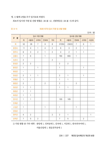 226 |227%uc81c3%uc7a5 %uc785%uc0ac%uc81c%ub3c4%uc758 %uac1c%uc120%uacfc %ubcf4%uc644%uba85, 11%uc6d4%uc5d0 4%uba85%uc744 %ucd94%uac00 %uc785%uc0ac%ud1a0%ub85d %ud558%uc600%ub2e4.%ucd5c%ucd08%uc758 %uc785%uc0ac%uc0dd %uc9c0%uc6d0 %ubc0f %uc120%ubc1c %ud604%ud669%uc740 <%ud45c %u2162 -4>, %uc120%ubc1c%uba85%ub2e8%uc740 <%ud45c %u2162 -5>%uc640 %uac19%ub2e4.%ud45c %u2162-4%ucd5c%ucd08(1975) %uc785%uc0ac %uc9c0%uc6d0 %ubc0f %uc120%ubc1c %ud604%ud669[%ub2e8%uc704 : %uba85]%uad6c %ubd84%uc785%uc0ac %uc9c0%uc6d0 %ud604%ud669%uc785%uc0ac%uc0dd %uc120%ubc1c %ud604%ud669%uacc4%uc11c%uc6b8%ub300%uace0%ub824%ub300%uc5f0%uc138%ub300%uae30%ud0c0%uacc4%uc11c%uc6b8%ub300%uc5f0%uc138%ub300%uace0%ub824%ub300%uc11c%uac15%ub300%uacc4522879837(35)23(22)761%ucd98%ucc9c%uc2dc1141426321%uc6d0%uc8fc%uc2dc832124211%uac15%ub989%uc2dc7617(6)6(5)1%uc18d%ucd08%uc2dc22%ucd98%uc131%uad702222%ud64d%ucc9c%uad701111%ud6a1%uc131%uad70%uc6d0%uc131%uad70211211%uc601%uc6d4%uad701111%ud3c9%ucc3d%uad702222%uc815%uc120%uad701111%ucca0%uc6d0%uad7011%ud654%ucc9c%uad7011%uc591%uad6c%uad70111(0)1(0)%uc778%uc81c%uad70-%uace0%uc131%uad701111%uc591%uc591%uad70%uba85%uc8fc%uad70422211%uc0bc%ucc99%uad707527521) %uc9c0%uc6d0 %ud604%ud669 %uc911 %uae30%ud0c0 %ub300%ud559 : %uc911%uc559%ub300 1, %uc778%ud558%uacf5%ub300 1, %ub2e8%uad6d%ub300 1, %uc11c%uac15%ub300 1, %ud55c%uad6d%uc678%uad6d%uc5b4%ub300 1, %uc11c%uc6b8%uc0b0%uc5c5%ub300 1, %uad11%uc6b4%uc804%uc790%uacf5%ub300 1