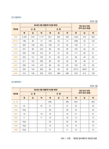 234 |235%uc81c3%uc7a5 %uc785%uc0ac%uc81c%ub3c4%uc758 %uac1c%uc120%uacfc %ubcf4%uc644(2) %ub3c4%ubd09%ud559%uc0ac[%ub2e8%uc704: %uba85]%uc5f0%ub3c4%ubcc4%uc785%uc0ac%uc0dd %uc120%ubc1c %ud604%ud669(%ucd94%uac00%uc120%ubc1c %uc81c%uc678)%uc5f0%uac04 %uc785%uc0ac %uc778%uc6d0(%ucd94%uac00 %uc785%uc0ac %ud3ec%ud568) %uc2e0 %uccad%uc120 %ubc1c%uacc4%ub0a8%uc5ec%uacc4%ub0a8%uc5ec%uacc4%ub0a8%uc5ec%ud569%uacc42,7509791,7718213924291,0244745502016.2108367210533721056337232017362138224109575214877712018331982338646401045549201934513021587474011756612020324131193874047984553202131110220980404099485120223501342168040401034558202330410420080404010712482359202431510620910374895581347612735(3) %ucd98%ucc9c%ud559%uc0ac[%ub2e8%uc704: %uba85]%uc5f0%ub3c4%ubcc4%uc785%uc0ac%uc0dd %uc120%ubc1c %ud604%ud669(%ucd94%uac00%uc120%ubc1c %uc81c%uc678)%uc5f0%uac04 %uc785%uc0ac %uc778%uc6d0(%ucd94%uac00 %uc785%uc0ac %ud3ec%ud568) %uc2e0 %uccad%uc120 %ubc1c%uacc4%ub0a8%uc5ec%uacc4%ub0a8%uc5ec%uacc4%ub0a8%uc5ec%ud569 %uacc450550564364319894242313143431990%ubbf8%uc0c120202323199119191616313119921111101014141993%ubbf8%uc0c1252529291994%ubbf8%uc0c1101015151995%ubbf8%uc0c111111313