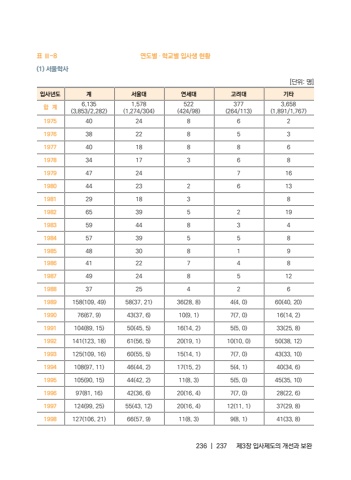 236 |237%uc81c3%uc7a5 %uc785%uc0ac%uc81c%ub3c4%uc758 %uac1c%uc120%uacfc %ubcf4%uc644%ud45c %u2162-8%uc5f0%ub3c4%ubcc4 %u302e %ud559%uad50%ubcc4 %uc785%uc0ac%uc0dd %ud604%ud669(1) %uc11c%uc6b8%ud559%uc0ac[%ub2e8%uc704: %uba85]%uc785%uc0ac%ub144%ub3c4%uacc4%uc11c%uc6b8%ub300%uc5f0%uc138%ub300%uace0%ub824%ub300%uae30%ud0c0%ud569 %uacc46,135(3,853/2,282)1,578(1,274/304)522(424/98)377(264/113)3,658(1,891/1,767)1975402486219763822853197740188861978341736819794724716198044232613198129183819826539521919835944834198457395581985483081919864122748198749248512198837254261989158(109, 49)58(37, 21)36(28, 8)4(4, 0)60(40, 20)199076(67, 9)43(37, 6)10(9, 1)7(7, 0)16(14, 2)1991104(89, 15)50(45, 5)16(14, 2)5(5, 0)33(25, 8)1992141(123, 18)61(56, 5)20(19, 1)10(10, 0)50(38, 12)1993125(109, 16)60(55, 5)15(14, 1)7(7, 0)43(33, 10)1994108(97, 11)46(44, 2)17(15, 2)5(4, 1)40(34, 6)1995105(90, 15)44(42, 2)11(8, 3)5(5, 0)45(35, 10)199697(81, 16)42(36, 6)20(16, 4)7(7, 0)28(22, 6)1997124(99, 25)55(43, 12)20(16, 4)12(11, 1)37(29, 8)1998127(106, 21)66(57, 9)11(8, 3)9(8, 1)41(33, 8)