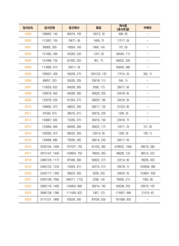 1999106(92, 14)84(74, 10)16(12, 4)6(6, 0)2000112(97, 15)79(71, 8)16(9, 7)17(17, 0)200195(65, 30)70(54, 16)18(4, 14)7(7, 0)-2002121(82, 39)53(30, 23)12(7, 5)56(45, 11)-2003141(68, 73)67(35, 32)8(1, 7)66(32, 34)-2004113(56, 57)20(11, 9)93(45, 48)-2005100(57, 43)55(28, 27)25(123, 12)17(14, 3)3(2, 1)200689(57, 32)55(35, 20)29(18, 11)5(4, 1)2007115(53, 62)64(28, 36)25(8, 17)26(17, 9)-2008128(74, 54)64(36, 28)40(20, 20)24(18, 6)-2009123(70, 53)61(34, 27)38(20, 18)24(16, 9)-2010109(62, 47)48(22, 26)30(17, 13)31(23, 8)-201197(40, 57)46(15, 31)39(16, 23)12(9, 3)2012130(67, 63)72(35, 37)35(16, 19)23(16, 7)2013123(64, 59)69(30, 39)39(22, 17)14(11, 3)1(1, 0)2014102(55, 47)66(32, 34)23(14, 9)12(9, 3)1(0, 1)2015134(66, 68)70(35, 35)38(14, 24)26(17, 9)-2016253(104, 149)107(37, 70)61(25, 36)478(32, 156)38(10, 28)2017291(147, 144)129(54, 75)78(43, 35)48(36, 12)36(14, 22)2018246(129, 117)87(48, 39)59(32, 27)22(14, 8)78(35, 43)2019245(122, 123)74(33, 41)42(15, 27)25(18, 7)104(56, 48)2020243(117, 126)58(23, 35)32(9, 23)29(24, 5)124(61, 63)2021292(136, 156)184(71, 113)22(8, 14)76(55, 21)10(2, 8)2022256(116, 140)143(54, 89)30(14, 16)63(38, 25)20(10, 10)2023266(128, 138)111(49, 62)19(7, 12)115(57, 58)21(15, 6)2024311(131, 180)63(29, 34)87(34, 53)161(68, 93)%uc785%uc0ac%ub144%ub3c4%uc785%uc0ac%uc778%uc6d0%uc911%uac04%ud1f4%uc0ac%uc878%uc5c5%uc7ac%uc0ac%uc911(%ud734%uc0ac%ud3ec%ud568)%ubbf8%ud655%uc778