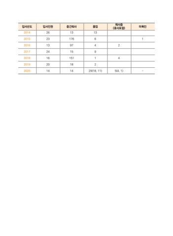 2014261313201523176612016139742201724159201816151142019201822020141429(18, 11)5(4, 1)%uc785%uc0ac%ub144%ub3c4%uc785%uc0ac%uc778%uc6d0%uc911%uac04%ud1f4%uc0ac%uc878%uc5c5%uc7ac%uc0ac%uc911(%ud734%uc0ac%ud3ec%ud568)%ubbf8%ud655%uc778