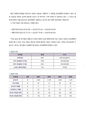 %ub9e4%ub144 %uac15%uc6d0%ud559%uc0ac%uc0dd%ub4e4%uc744 %ub300%uc0c1%uc73c%ub85c %ub9cc%uc871%ub3c4 %uc124%ubb38%uc744 %uc2dc%ud589%ud558%uc5ec %uadf8 %uacb0%uacfc%ub97c %uc6b4%uc601%uacc4%ud68d%uc5d0 %ubc18%uc601%ud558%uace0 %uc788%ub2e4. %ud2b9%ud788 2020%ub144 %uc804%ud6c4%ub85c %uae09%uaca9%ud788 %ud655%uc0b0%ub41c %ucf54%ub85c%ub098 19 %ubc14%uc774%ub7ec%uc2a4 %uc774%ud6c4 %ub9cc%uc871%ub3c4%uac00 %uc0c1%uc2b9%ud558%uace0 %uc788%ub2e4. %uadf8 %uc774%uc720%ub294 %ud1b5%uc81c %uc911%uc2ec%uc5d0%uc11c %uc790%uc728 %uc911%uc2ec%uc73c%ub85c %uad00%ub9ac%ubc29%ud5a5%uc774 %uc804%ud658%ub418%uace0, %uae09%uc2dd%uc758 %uc9c8%uc774 %ub300%ud3ed %uac1c%uc120%ub418%uc5c8%uae30 %ub54c%ubb38%uc774%ub2e4. %uadf8 %uc774%ud6c4 3%uac1c%ub144 %uc0ac%uc0dd %ub9cc%uc871%ub3c4%ub294 %uc544%ub798%uc640 %uac19%ub2e4. - %uc885%ud569 %ub9cc%uc871%ub3c4(2021%ub144 81.8% %u2192 2022%ub144 87.4% %u2192 2023%ub144 90.0%)- %uc0dd%ud65c %ub9cc%uc871%ub3c4(2021%ub144 75.1% %u2192 2022%ub144 79.4% %u2192 2023%ub144 86.5%)%u300c%ube44%uc804 2025 %uc911%u00b7%uc7a5%uae30%ubc1c%uc804 %uacc4%ud68d%u300d%uc758 %ube44%uc804%uacfc %uc804%ub7b5%uc774 %uc6b4%uc601 %ubc29%ud5a5%uc774%ub77c%uba74 %uc8fc%uc694 %uc9c0%ud45c%ub294 %ub2e8%ub144%ub3c4 %uc6b4%uc601%uacc4%ud68d%uc758 %ubaa9%ud45c%ub77c %ud560 %uc218 %uc788%ub2e4. %uc8fc%uc694 %uc9c0%ud45c%ub294 %ud56d%uc0c1%uc131 %uc9c0%ud45c%uc640 %ubc1c%uc804%uc131 %uc9c0%ud45c%ub85c %uad6c%ubd84%ud558%uace0 %uc788%ub2e4. %uc804%uc790%ub294 %ud559%uc0ac%uc6b4%uc601%uc758 %uae30%uc900%uc73c%ub85c, %ud6c4%uc790%ub294 %uc5f0%ub3c4%ubcc4%ub85c %ub3c4%ub2ec%ud574%uc57c %ud560 %ubaa9%ud45c%ub85c %uc6b4%uc601%uacc4%ud68d%uc5d0 %ubc18%uc601%ud558%uace0 %uc788%ub2e4.%u25cb %ud56d%uc0c1%uc131 %uc9c0%ud45c %uc9c0 %ud45c %uba85%ubaa9 %ud45c%ube44 %uace0%uace0%uac1d%ub9cc%uc871%ub3c488%%ub9cc%uc871%uc774%uc0c1/%uc751%ub2f5%uc790%uc2181%ud559%uae30 %uc7ac%uc0ac%uc728(3/10%uae30%uc900)100%%uc7ac%uc0ac%uc778%uc6d0/%uc815%uc6d02%ud559%uae30 %uc7ac%uc0ac%uc728(9/10%uae30%uc900)85%%uc7ac%uc0ac%uc778%uc6d0/%uc815%uc6d0%uc18c%ubaa8%uc784 %uc9c0%uc6d0(%ud559%uae30%ud3c9%uade0)6%uac1c%ud559%uc0ac%ubcc4%u25cb %ubc1c%uc804%uc131 %uc9c0%ud45c%uc9c0 %ud45c %uba85%ub2e8%uc7042022202320242025%uae09%uc2dd%ub2e8%uac00%uc6d02,5002,7002,9003,100%uc2dc%uc124 %uac1c%uc120%uc728%65758085%uac10%uac00%uc0c1%uac01 %uc801%ub9bd%ub960%5678%uc219%uc6b0%ud68cD/B %uad6c%ucd95%ub960%25303540%uc219%uc6b0%ud68c %uc0ac%ud68c%uacf5%ud5cc %ud655%ub300%uba85120140160200%ud559%uc0ac%uc0dd %uc0ac%ud68c%uacf5%ud5cc %ud655%ub300%uba85120140160200