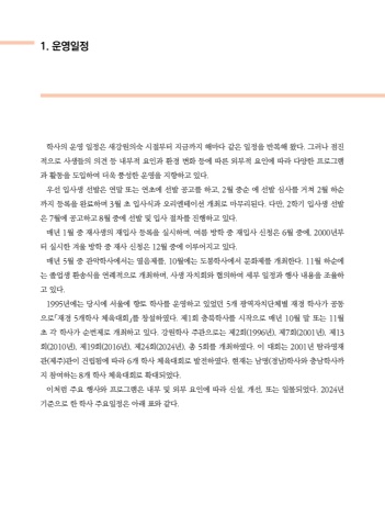 %ud559%uc0ac%uc758 %uc6b4%uc601 %uc77c%uc815%uc740 %uc0c8%uac15%uc6d0%uc758%uc219 %uc2dc%uc808%ubd80%ud130 %uc9c0%uae08%uae4c%uc9c0 %ud574%ub9c8%ub2e4 %uac19%uc740 %uc77c%uc815%uc744 %ubc18%ubcf5%ud574 %uc654%ub2e4. %uadf8%ub7ec%ub098 %uc810%uc9c4%uc801%uc73c%ub85c %uc0ac%uc0dd%ub4e4%uc758 %uc758%uacac %ub4f1 %ub0b4%ubd80%uc801 %uc694%uc778%uacfc %ud658%uacbd %ubcc0%ud654 %ub4f1%uc5d0 %ub530%ub978 %uc678%ubd80%uc801 %uc694%uc778%uc5d0 %ub530%ub77c %ub2e4%uc591%ud55c %ud504%ub85c%uadf8%ub7a8%uacfc %ud65c%ub3d9%uc744 %ub3c4%uc785%ud558%uc5ec %ub354%uc6b1 %ud48d%uc131%ud55c %uc6b4%uc601%uc744 %uc9c0%ud5a5%ud558%uace0 %uc788%ub2e4. %uc6b0%uc120 %uc785%uc0ac%uc0dd %uc120%ubc1c%uc740 %uc5f0%ub9d0 %ub610%ub294 %uc5f0%ucd08%uc5d0 %uc120%ubc1c %uacf5%uace0%ub97c %ud558%uace0, 2%uc6d4 %uc911%uc21c %uc5d0 %uc120%ubc1c %uc2ec%uc0ac%ub97c %uac70%uccd0 2%uc6d4 %ud558%uc21c%uae4c%uc9c0 %ub4f1%ub85d%uc744 %uc644%ub8cc%ud558%uba70 3%uc6d4 %ucd08 %uc785%uc0ac%uc2dd%uacfc %uc624%ub9ac%uc5d4%ud14c%uc774%uc158 %uac1c%ucd5c%ub85c %ub9c8%ubb34%ub9ac%ub41c%ub2e4. %ub2e4%ub9cc, 2%ud559%uae30 %uc785%uc0ac%uc0dd %uc120%ubc1c%uc740 7%uc6d4%uc5d0 %uacf5%uace0%ud558%uace0 8%uc6d4 %uc911%uc5d0 %uc120%ubc1c %ubc0f %uc785%uc0ac %uc808%ucc28%ub97c %uc9c4%ud589%ud558%uace0 %uc788%ub2e4.%ub9e4%ub144 1%uc6d4 %uc911 %uc7ac%uc0ac%uc0dd%uc758 %uc7ac%uc785%uc0ac %ub4f1%ub85d%uc744 %uc2e4%uc2dc%ud558%uba70, %uc5ec%ub984 %ubc29%ud559 %uc911 %uc7ac%uc785%uc0ac %uc2e0%uccad%uc740 6%uc6d4 %uc911%uc5d0, 2000%ub144%ubd80%ud130 %uc2e4%uc2dc%ud55c %uaca8%uc6b8 %ubc29%ud559 %uc911 %uc7ac%uc0ac %uc2e0%uccad%uc740 12%uc6d4 %uc911%uc5d0 %uc774%ub8e8%uc5b4%uc9c0%uace0 %uc788%ub2e4. %ub9e4%ub144 5%uc6d4 %uc911 %uad00%uc545%ud559%uc0ac%uc5d0%uc11c%ub294 %uc5f4%uc74c%uc81c%ub97c, 10%uc6d4%uc5d0%ub294 %ub3c4%ubd09%ud559%uc0ac%uc5d0%uc11c %ubb38%ud654%uc81c%ub97c %uac1c%ucd5c%ud55c%ub2e4. 11%uc6d4 %ud558%uc21c%uc5d0%ub294 %uc878%uc5c5%uc0dd %ud658%uc1a1%uc2dd%uc744 %uc5f0%ub840%uc801%uc73c%ub85c %uac1c%ucd5c%ud558%uba70, %uc0ac%uc0dd %uc790%uce58%ud68c%uc640 %ud611%uc758%ud558%uc5ec %uc138%ubd80 %uc77c%uc815%uacfc %ud589%uc0ac %ub0b4%uc6a9%uc744 %uc870%uc728%ud558%uace0 %uc788%ub2e4.1995%ub144%uc5d0%ub294 %ub2f9%uc2dc%uc5d0 %uc11c%uc6b8%uc5d0 %ud5a5%ud1a0 %ud559%uc0ac%ub97c %uc6b4%uc601%ud558%uace0 %uc788%uc5c8%ub358 5%uac1c %uad11%uc5ed%uc790%uce58%ub2e8%uccb4%ubcc4 %uc7ac%uacbd %ud559%uc0ac%uac00 %uacf5%ub3d9%uc73c%ub85c%u300c%uc7ac%uacbd 5%uac1c%ud559%uc0ac %uccb4%uc721%ub300%ud68c%u300d%ub97c %ucc3d%uc124%ud558%uc600%ub2e4. %uc81c1%ud68c %ucda9%ubd81%ud559%uc0ac%ub97c %uc2dc%uc791%uc73c%ub85c %ub9e4%ub144 10%uc6d4 %ub9d0 %ub610%ub294 11%uc6d4 %ucd08 %uac01 %ud559%uc0ac%uac00 %uc21c%ubc88%uc81c%ub85c %uac1c%ucd5c%ud558%uace0 %uc788%ub2e4. %uac15%uc6d0%ud559%uc0ac %uc8fc%uad00%uc73c%ub85c%ub294 %uc81c2%ud68c(1996%ub144), %uc81c7%ud68c(2001%ub144), %uc81c13%ud68c(2010%ub144), %uc81c19%ud68c(2016%ub144), %uc81c24%ud68c(2024%ub144), %ucd1d 5%ud68c%ub97c %uac1c%ucd5c%ud558%uc600%ub2e4. %uc774 %ub300%ud68c%ub294 2001%ub144 %ud0d0%ub77c%uc601%uc7ac%uad00(%uc81c%uc8fc)%uad00%uc774 %uac74%ub9bd%ub428%uc5d0 %ub530%ub77c 6%uac1c %ud559%uc0ac %uccb4%uc721%ub300%ud68c%ub85c %ubc1c%uc804%ud558%uc600%ub2e4. %ud604%uc7ac%ub294 %ub0a8%uba85(%uacbd%ub0a8)%ud559%uc0ac%uc640 %ucda9%ub0a8%ud559%uc0ac%uae4c%uc9c0 %ucc38%uc5ec%ud558%ub294 8%uac1c %ud559%uc0ac %uccb4%uc721%ub300%ud68c%ub85c %ud655%ub300%ub418%uc5c8%ub2e4. %uc774%ucc98%ub7fc %uc8fc%uc694 %ud589%uc0ac%uc640 %ud504%ub85c%uadf8%ub7a8%uc740 %ub0b4%ubd80 %ubc0f %uc678%ubd80 %uc694%uc778%uc5d0 %ub530%ub77c %uc2e0%uc124, %uac1c%uc120, %ub610%ub294 %uc77c%ubab0%ub418%uc5c8%ub2e4. 2024%ub144 %uae30%uc900%uc73c%ub85c %ud55c %ud559%uc0ac %uc8fc%uc694%uc77c%uc815%uc740 %uc544%ub798 %ud45c%uc640 %uac19%ub2e4.1. %uc6b4%uc601%uc77c%uc815