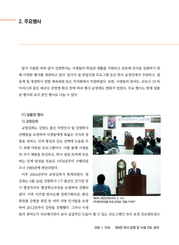 258 |259%uc81c4%uc7a5 %ud559%uc0ac %uc6b4%uc601 %ubc0f %uc0ac%uc0dd %uc9c0%ub3c4 %uad00%ub9ac%uc55e%uc11c %uae30%uc220%ud55c %ubc14%uc640 %uac19%uc774 %uac15%uc6d0%ud559%uc0ac%ub294 %uc0ac%uc0dd%ub4e4%uc758 %ud559%uc5c5%uacfc %uc0dd%ud65c%uc744 %uc9c0%uc6d0%ud558%uace0 %uacf5%ub3d9%uccb4 %uc758%uc2dd%uc744 %uac15%ud654%ud558%uae30 %uc704%ud574 %ub2e4%uc591%ud55c %ud589%uc0ac%ub97c %uac1c%ucd5c%ud558%uace0 %uc788%ub2e4. %uc785%uc0ac%uc2dd %ubc0f %ucde8%uc5c5%uc9c0%uc6d0 %ud504%ub85c%uadf8%ub7a8 %ub4f1%uc740 %ud559%uc0ac %uc6b4%uc601%uc9c4%uc5d0%uc11c %uc8fc%uad00%ud558%uace0, %uc5f4%uc74c%uc81c %ubc0f %uc7ac%uacbd%ud559%uc0ac %uc5f0%ud569 %uccb4%uc721%ub300%ud68c %ub4f1%uc740 %uc790%uce58%ud68c%uc5d0%uc11c %uc8fc%uad00%ud558%uc600%ub2e4. %ub610%ud55c, %uc0ac%uc0dd%ub4e4%uc758 %ucc38%uc5ec%ub3c4, %ucf54%ub85c%ub098 19 %ubc14%uc774%ub7ec%uc2a4%uc640 %uac19%uc740 %ub300%uaddc%ubaa8 %uac10%uc5fc%ubcd1 %ud655%uc0b0 %ub4f1%uc5d0 %ub530%ub77c %ud589%uc0ac %uc6b4%uc601%uc5d0%ub3c4 %ubcc0%ud654%uac00 %uc788%uc5c8%ub2e4. %uc8fc%uc694 %ud589%uc0ac%ub294 %ud604%uc7ac %uc77c%ubab0%ub41c %ud589%uc0ac%uc640 %uc720%uc9c0 %uc911%uc778 %ud589%uc0ac%ub85c %ub098%ub20c %uc218 %uc788%ub2e4.(1) %uc77c%ubab0%ub41c %ud589%uc0ac1) %uad50%uc591%uac15%uc88c %uad50%uc591%uac15%uc88c%ub294 %uac15%uc6d0%ub3c4 %ucd9c%uc2e0 %uc800%uba85%uc778%uc0ac %ubc0f %uac15%uc6d0%ud559%uc0ac %uc120%ubc30%ub4e4%uc744 %ucd08%uccad%ud558%uc5ec %uc0ac%uc0dd%ub4e4%uc5d0%uac8c %ud3ed%ub113%uc740 %uc9c0%uc2dd%uacfc %uacbd%ud5d8%uc744 %uc804%ud558%uace0, %uc778%uaca9 %ud615%uc131%uacfc %uc9c4%ub85c %uc120%ud0dd%uc5d0 %ub3c4%uc6c0%uc744 %uc8fc%uae30 %uc704%ud574 %ub9c8%ub828%ub41c %ud504%ub85c%uadf8%ub7a8%uc774%ub2e4. %uc774%ub97c %ud1b5%ud574 %uc0ac%uc0dd%ub4e4%uc758 %uc790%uae30 %uacc4%ubc1c%uc744 %ucd09%uc9c4%ud558%uace0, %ud559%uc0ac %uc124%ub9bd %ubaa9%uc801%uc5d0 %ubd80%uc751%ud558%ub294 %uc778%uc7ac %uc591%uc131%uc744 %ubaa9%ud45c%ub85c 1976%ub144%ubd80%ud130 %uc2dc%ud589%ub418%uc5c8%uc73c%ub098 1983%ub144%uc5d0 %uc911%ub2e8%ub418%uc5c8%ub2e4.%uc774%ud6c4 2004%ub144%ubd80%ud130 %uad50%uc591%uac15%uc88c%uac00 %uc7ac%uac1c%ub418%uc5c8%ub2e4. %uccab %uac15%uc88c%ub294 4%uc6d4 26%uc77c %uac15%uc6d0%ud559%uc0ac 1%uae30 %ucd9c%uc2e0%uc778 %uac15%uae30%ucc3d %ub2f9%uc2dc %ud589%uc815%uc790%uce58%ubd80 %ud589%uc815%ud601%uc2e0%uad6d%uc7a5%uc744 %ucd08%uccad%ud558%uc5ec %uc9c4%ud589%ub418%uc5c8%ub2e4. %uc774%ud6c4 %uc774%uc8fc%uc5f4 %ud55c%uad6d%uc740%ud589 %uc815%ucc45%uae30%ud68d%uad6d%uc7a5, %ud654%uc9c4%ud654%uc7a5%ud488 %uac15%ud604%uc1a1 %ud68c%uc7a5 %ub4f1 %uc5ec%ub7ec %uc800%uba85 %uc778%uc0ac%ub4e4%uc744 %ucd08%uccad%ud558%uc5ec 2012%ub144%uae4c%uc9c0 %uac15%uc5f0%uc744 %uc9c4%ud589%ud588%ub2e4. %uadf8%ub7ec%ub098 %uc0ac%uc0dd%ub4e4%uc758 %ucc38%uc5ec%ub3c4%uac00 %uc800%uc870%ud574%uc9c0%uba74%uc11c %ubcf4%ub2e4 %uc2e4%uc9c8%uc801%uc778 %ub3c4%uc6c0%uc774 %ub420 %uc218 %uc788%ub294 %ud504%ub85c%uadf8%ub7a8%uc778 %uc219%uc6b0 %ucd08%uccad %uc9c4%ub85c%uba58%ud1a0%ub9c1%uc73c2. %uc8fc%uc694%ud589%uc0ac%uc81c6%ud68c %uad50%uc591%uac15%uc88c(2005. 5. 18.) (%uc8fc)%ud654%uc9c4%ud654%uc7a5%ud488 %ud68c%uc7a5 %uac15%ud604%uc1a1 %u201c%uafc8%uc744 %uac00%uc838%ub77c%u201d
