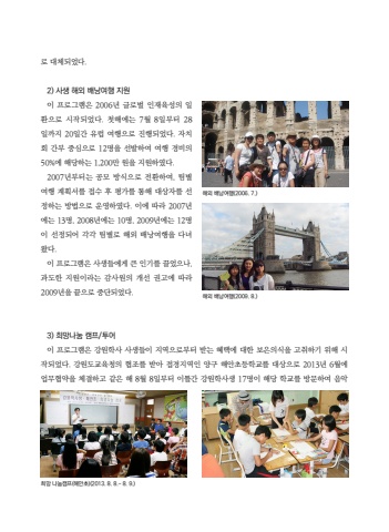 %ub85c %ub300%uccb4%ub418%uc5c8%ub2e4. 2) %uc0ac%uc0dd %ud574%uc678 %ubc30%ub0ad%uc5ec%ud589 %uc9c0%uc6d0%uc774 %ud504%ub85c%uadf8%ub7a8%uc740 2006%ub144 %uae00%ub85c%ubc8c %uc778%uc7ac%uc721%uc131%uc758 %uc77c%ud658%uc73c%ub85c %uc2dc%uc791%ub418%uc5c8%ub2e4. %uccab%ud574%uc5d0%ub294 7%uc6d4 8%uc77c%ubd80%ud130 28%uc77c%uae4c%uc9c0 20%uc77c%uac04 %uc720%ub7fd %uc5ec%ud589%uc73c%ub85c %uc9c4%ud589%ub418%uc5c8%ub2e4. %uc790%uce58%ud68c %uac04%ubd80 %uc911%uc2ec%uc73c%ub85c 12%uba85%uc744 %uc120%ubc1c%ud558%uc5ec %uc5ec%ud589 %uacbd%ube44%uc758 50%%uc5d0 %ud574%ub2f9%ud558%ub294 1,200%ub9cc %uc6d0%uc744 %uc9c0%uc6d0%ud558%uc600%ub2e4.2007%ub144%ubd80%ud130%ub294 %uacf5%ubaa8 %ubc29%uc2dd%uc73c%ub85c %uc804%ud658%ud558%uc5ec, %ud300%ubcc4 %uc5ec%ud589 %uacc4%ud68d%uc11c%ub97c %uc811%uc218 %ud6c4 %ud3c9%uac00%ub97c %ud1b5%ud574 %ub300%uc0c1%uc790%ub97c %uc120%uc815%ud558%ub294 %ubc29%ubc95%uc73c%ub85c %uc6b4%uc601%ud558%uc600%ub2e4. %uc774%uc5d0 %ub530%ub77c 2007%ub144%uc5d0%ub294 13%uba85, 2008%ub144%uc5d0%ub294 10%uba85, 2009%ub144%uc5d0%ub294 12%uba85%uc774 %uc120%uc815%ub418%uc5b4 %uac01%uac01 %ud300%ubcc4%ub85c %ud574%uc678 %ubc30%ub0ad%uc5ec%ud589%uc744 %ub2e4%ub140%uc654%ub2e4.%uc774 %ud504%ub85c%uadf8%ub7a8%uc740 %uc0ac%uc0dd%ub4e4%uc5d0%uac8c %ud070 %uc778%uae30%ub97c %ub04c%uc5c8%uc73c%ub098, %uacfc%ub3c4%ud55c %uc9c0%uc6d0%uc774%ub77c%ub294 %uac10%uc0ac%uc6d0%uc758 %uac1c%uc120 %uad8c%uace0%uc5d0 %ub530%ub77c 2009%ub144%uc744 %ub05d%uc73c%ub85c %uc911%ub2e8%ub418%uc5c8%ub2e4. 3) %ud76c%ub9dd%ub098%ub214 %ucea0%ud504/%ud22c%uc5b4%uc774 %ud504%ub85c%uadf8%ub7a8%uc740 %uac15%uc6d0%ud559%uc0ac %uc0ac%uc0dd%ub4e4%uc774 %uc9c0%uc5ed%uc73c%ub85c%ubd80%ud130 %ubc1b%ub294 %ud61c%ud0dd%uc5d0 %ub300%ud55c %ubcf4%uc740%uc758%uc2dd%uc744 %uace0%ucde8%ud558%uae30 %uc704%ud574 %uc2dc%uc791%ub418%uc5c8%ub2e4. %uac15%uc6d0%ub3c4%uad50%uc721%uccad%uc758 %ud611%uc870%ub97c %ubc1b%uc544 %uc811%uacbd%uc9c0%uc5ed%uc778 %uc591%uad6c %ud574%uc548%ucd08%ub4f1%ud559%uad50%ub97c %ub300%uc0c1%uc73c%ub85c 2013%ub144 6%uc6d4%uc5d0 %uc5c5%ubb34%ud611%uc57d%uc744 %uccb4%uacb0%ud558%uace0 %uac19%uc740 %ud574 8%uc6d4 8%uc77c%ubd80%ud130 %uc774%ud2c0%uac04 %uac15%uc6d0%ud559%uc0ac%uc0dd 17%uba85%uc774 %ud574%ub2f9 %ud559%uad50%ub97c %ubc29%ubb38%ud558%uc5ec %uc74c%uc545%ud574%uc678 %ubc30%ub0ad%uc5ec%ud589(2006. 7.)%ud574%uc678 %ubc30%ub0ad%uc5ec%ud589(2009. 8.)%ud76c%ub9dd %ub098%ub214%ucea0%ud504(%ud574%uc548%ucd08)(2013. 8. 8.~ 8. 9.)