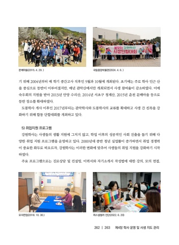 262 |263%uc81c4%uc7a5 %ud559%uc0ac %uc6b4%uc601 %ubc0f %uc0ac%uc0dd %uc9c0%ub3c4 %uad00%ub9ac%uae30 %uc704%ud574 2004%ub144%ubd80%ud130 %ub9e4 %ud559%uae30 %uc911%uac04%uace0%uc0ac %uc9c1%ud6c4%uc778 5%uc6d4%uacfc 10%uc6d4%uc5d0 %uac1c%ucd5c%ub41c%ub2e4. %ucd08%uae30%uc5d0%ub294 %uc8fc%ub85c %ud559%uc0ac %uc778%uadfc %uc0b0%uc744 %uc911%uc2ec%uc73c%ub85c %ub4f1%ubc18%uc774 %uc774%ub8e8%uc5b4%uc84c%uc9c0%ub9cc, %ub9e4%ub144 %uad00%uc545%uc0b0%uc5d0%uc11c%ub9cc %uac1c%ucd5c%ub418%uba74%uc11c %uc0ac%uc0dd %ucc38%uc5ec%uc728%uc774 %uac10%uc18c%ud558%uc600%ub2e4. %uc774%uc5d0 %uc219%uc6b0%ud68c%uc758 %uc9c0%uc6d0%uc744 %ubc1b%uc544 2013%ub144 %uc548%uc591 %uc218%ub9ac%uc0b0, 2014%ub144 %uc11c%ucd08%uad6c %uccad%uacc4%uc0b0, 2015%ub144 %ucd98%ucc9c %ubb38%ubc30%ub9c8%uc744 %ub4f1%uc73c%ub85c %ub4f1%ubc18 %uc7a5%uc18c%ub97c %ud655%ub300%ud558%uc600%ub2e4. %ub3c4%ubd09%ud559%uc0ac %uac1c%uc0ac %uc774%ud6c4%uc778 2017%ub144%ubd80%ud130%ub294 %uad00%uc545%ud559%uc0ac%uc640 %ub3c4%ubd09%ud559%uc0ac%uc758 %uad50%ub958%ub97c %ud655%ub300%ud558%uace0 %uc0ac%uc0dd %uac04 %uce5c%ubaa9%uc744 %uac15%ud654%ud558%uae30 %uc704%ud574 %ud569%ub3d9 %ub2e8%ud569%ub300%ud68c%ub97c %uac1c%ucd5c%ud558%uace0 %uc788%ub2e4. 5) %ucde8%uc5c5%uc9c0%uc6d0 %ud504%ub85c%uadf8%ub7a8%uac15%uc6d0%ud559%uc0ac%ub294 %uc0ac%uc0dd%ub4e4%uc758 %uc0dd%ud65c %uc9c0%uc6d0%uc5d0 %uadf8%uce58%uc9c0 %uc54a%uace0, %ud559%uc5c5 %uc774%ud6c4%uc758 %uc131%uacf5%uc801%uc778 %uc0ac%ud68c %uc9c4%ucd9c%uc744 %ub3d5%uae30 %uc704%ud574 %ub2e4%uc591%ud55c %ucde8%uc5c5 %uc9c0%uc6d0 %ud504%ub85c%uadf8%ub7a8%uc744 %uc6b4%uc601%ud558%uace0 %uc788%ub2e4. 2000%ub144%ub300 %uc911%ubc18 %uccad%ub144 %uc2e4%uc5c5%ub960%uc774 %uc99d%uac00%ud558%uba74%uc11c %ucde8%uc5c5 %uacbd%uc7c1%ub825%uc774 %uc911%uc694%ud55c %ud654%ub450%ub85c %ub5a0%uc624%ub974%uc790, %uac15%uc6d0%ud559%uc0ac%ub294 %uc774%ub7ec%ud55c %ubcc0%ud654%uc5d0 %ub9de%ucd94%uc5b4 %uc0ac%uc0dd%ub4e4%uc758 %ucde8%uc5c5 %uc9c0%uc6d0%uc744 %uac15%ud654%ud558%uae30 %uc2dc%uc791%ud558%uc600%ub2e4.%uc8fc%uc694 %ud504%ub85c%uadf8%ub7a8%uc73c%ub85c%ub294 %uc9c4%ub85c%uc0c1%ub2f4 %ubc0f %ucee8%uc124%ud305, %uc774%ub825%uc11c%uc640 %uc790%uae30%uc18c%uac1c%uc11c %uc791%uc131%ubc95%uc5d0 %ub300%ud55c %uac15%uc758, %ubaa8%uc758 %uba74%uc811, %ubb38%ubc30%ub9c8%uc744(2015. 4. 29. )%uad6d%ub9bd%uc911%uc559%ubc15%ubb3c%uad00(2024. 4. 6. )%ubaa8%uc758%uba74%uc811(2018. 10. 30.)%ud37c%uc2a4%ub110%uceec%ub7ec %uc9c4%ub2e8(2022. 6. 20)