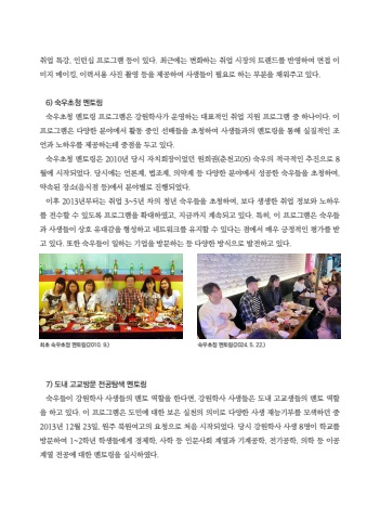 %ucde8%uc5c5 %ud2b9%uac15, %uc778%ud134%uc2ed %ud504%ub85c%uadf8%ub7a8 %ub4f1%uc774 %uc788%ub2e4. %ucd5c%uadfc%uc5d0%ub294 %ubcc0%ud654%ud558%ub294 %ucde8%uc5c5 %uc2dc%uc7a5%uc758 %ud2b8%ub80c%ub4dc%ub97c %ubc18%uc601%ud558%uc5ec %uba74%uc811 %uc774%ubbf8%uc9c0 %uba54%uc774%ud0b9, %uc774%ub825%uc11c%uc6a9 %uc0ac%uc9c4 %ucd2c%uc601 %ub4f1%uc744 %uc81c%uacf5%ud558%uc5ec %uc0ac%uc0dd%ub4e4%uc774 %ud544%uc694%ub85c %ud558%ub294 %ubd80%ubd84%uc744 %ucc44%uc6cc%uc8fc%uace0 %uc788%ub2e4. 6) %uc219%uc6b0%ucd08%uccad %uba58%ud1a0%ub9c1%uc219%uc6b0%ucd08%uccad %uba58%ud1a0%ub9c1 %ud504%ub85c%uadf8%ub7a8%uc740 %uac15%uc6d0%ud559%uc0ac%uac00 %uc6b4%uc601%ud558%ub294 %ub300%ud45c%uc801%uc778 %ucde8%uc5c5 %uc9c0%uc6d0 %ud504%ub85c%uadf8%ub7a8 %uc911 %ud558%ub098%uc774%ub2e4. %uc774 %ud504%ub85c%uadf8%ub7a8%uc740 %ub2e4%uc591%ud55c %ubd84%uc57c%uc5d0%uc11c %ud65c%ub3d9 %uc911%uc778 %uc120%ubc30%ub4e4%uc744 %ucd08%uccad%ud558%uc5ec %uc0ac%uc0dd%ub4e4%uacfc%uc758 %uba58%ud1a0%ub9c1%uc744 %ud1b5%ud574 %uc2e4%uc9c8%uc801%uc778 %uc870%uc5b8%uacfc %ub178%ud558%uc6b0%ub97c %uc81c%uacf5%ud558%ub294%ub370 %uc911%uc810%uc744 %ub450%uace0 %uc788%ub2e4. %uc219%uc6b0%ucd08%uccad %uba58%ud1a0%ub9c1%uc740 2010%ub144 %ub2f9%uc2dc %uc790%uce58%ud68c%uc7a5%uc774%uc5c8%ub358 %uc6d0%ud76c%uad8c(%ucd98%ucc9c%uace005) %uc219%uc6b0%uc758 %uc801%uadf9%uc801%uc778 %ucd94%uc9c4%uc73c%ub85c 8%uc6d4%uc5d0 %uc2dc%uc791%ub418%uc5c8%ub2e4. %ub2f9%uc2dc%uc5d0%ub294 %uc5b8%ub860%uacc4, %ubc95%uc870%uacc4, %uc758%uc57d%uacc4 %ub4f1 %ub2e4%uc591%ud55c %ubd84%uc57c%uc5d0%uc11c %uc131%uacf5%ud55c %uc219%uc6b0%ub4e4%uc744 %ucd08%uccad%ud558%uc5ec, %uc57d%uc18d%ub41c %uc7a5%uc18c(%uc74c%uc2dd%uc810 %ub4f1)%uc5d0%uc11c %ubd84%uc57c%ubcc4%ub85c %uc9c4%ud589%ub418%uc5c8%ub2e4. %uc774%ud6c4 2013%ub144%ubd80%ud130%ub294 %ucde8%uc5c5 3~5%ub144 %ucc28%uc758 %uccad%ub144 %uc219%uc6b0%ub4e4%uc744 %ucd08%uccad%ud558%uc5ec, %ubcf4%ub2e4 %uc0dd%uc0dd%ud55c %ucde8%uc5c5 %uc815%ubcf4%uc640 %ub178%ud558%uc6b0%ub97c %uc804%uc218%ud560 %uc218 %uc788%ub3c4%ub85d %ud504%ub85c%uadf8%ub7a8%uc744 %ud655%ub300%ud558%uc600%uace0, %uc9c0%uae08%uae4c%uc9c0 %uacc4%uc18d%ub418%uace0 %uc788%ub2e4. %ud2b9%ud788, %uc774 %ud504%ub85c%uadf8%ub7a8%uc740 %uc219%uc6b0%ub4e4%uacfc %uc0ac%uc0dd%ub4e4%uc774 %uc0c1%ud638 %uc720%ub300%uac10%uc744 %ud615%uc131%ud558%uace0 %ub124%ud2b8%uc6cc%ud06c%ub97c %uc720%uc9c0%ud560 %uc218 %uc788%ub2e4%ub294 %uc810%uc5d0%uc11c %ub9e4%uc6b0 %uae0d%uc815%uc801%uc778 %ud3c9%uac00%ub97c %ubc1b%uace0 %uc788%ub2e4. %ub610%ud55c %uc219%uc6b0%ub4e4%uc774 %uc77c%ud558%ub294 %uae30%uc5c5%uc744 %ubc29%ubb38%ud558%ub294 %ub4f1 %ub2e4%uc591%ud55c %ubc29%uc2dd%uc73c%ub85c %ubc1c%uc804%ud558%uace0 %uc788%ub2e4.7) %ub3c4%ub0b4 %uace0%uad50%ubc29%ubb38 %uc804%uacf5%ud0d0%uc0c9 %uba58%ud1a0%ub9c1%uc219%uc6b0%ub4e4%uc774 %uac15%uc6d0%ud559%uc0ac %uc0ac%uc0dd%ub4e4%uc758 %uba58%ud1a0 %uc5ed%ud560%uc744 %ud55c%ub2e4%uba74, %uac15%uc6d0%ud559%uc0ac %uc0ac%uc0dd%ub4e4%uc740 %ub3c4%ub0b4 %uace0%uad50%uc0dd%ub4e4%uc758 %uba58%ud1a0 %uc5ed%ud560%uc744 %ud558%uace0 %uc788%ub2e4. %uc774 %ud504%ub85c%uadf8%ub7a8%uc740 %ub3c4%ubbfc%uc5d0 %ub300%ud55c %ubcf4%uc740 %uc2e4%ucc9c%uc758 %uc758%ubbf8%ub85c %ub2e4%uc591%ud55c %uc0ac%uc0dd %uc7ac%ub2a5%uae30%ubd80%ub97c %ubaa8%uc0c9%ud558%ub358 %uc911 2013%ub144 12%uc6d4 23%uc77c, %uc6d0%uc8fc %ubd81%uc6d0%uc5ec%uace0%uc758 %uc694%uccad%uc73c%ub85c %ucc98%uc74c %uc2dc%uc791%ub418%uc5c8%ub2e4. %ub2f9%uc2dc %uac15%uc6d0%ud559%uc0ac %uc0ac%uc0dd 8%uba85%uc774 %ud559%uad50%ub97c %ubc29%ubb38%ud558%uc5ec 1~2%ud559%ub144 %ud559%uc0dd%ub4e4%uc5d0%uac8c %uacbd%uc81c%ud559, %uc0ac%ud559 %ub4f1 %uc778%ubb38%uc0ac%ud68c %uacc4%uc5f4%uacfc %uae30%uacc4%uacf5%ud559, %uc804%uae30%uacf5%ud559, %uc758%ud559 %ub4f1 %uc774%uacf5%uacc4%uc5f4 %uc804%uacf5%uc5d0 %ub300%ud55c %uba58%ud1a0%ub9c1%uc744 %uc2e4%uc2dc%ud558%uc600%ub2e4. %ucd5c%ucd08 %uc219%uc6b0%ucd08%uc815 %uba58%ud1a0%ub9c1(2010. 9.)%uc219%uc6b0%ucd08%uccad %uba58%ud1a0%ub9c1(2024. 5. 22.)