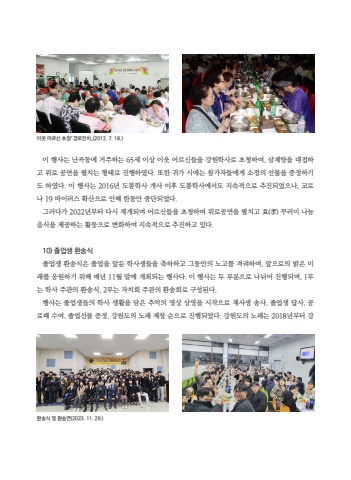 %uc774 %ud589%uc0ac%ub294 %ub09c%uace1%ub3d9%uc5d0 %uac70%uc8fc%ud558%ub294 65%uc138 %uc774%uc0c1 %uc774%uc6c3 %uc5b4%ub974%uc2e0%ub4e4%uc744 %uac15%uc6d0%ud559%uc0ac%ub85c %ucd08%uccad%ud558%uc5ec, %uc0bc%uacc4%ud0d5%uc744 %ub300%uc811%ud558%uace0 %uc704%ub85c %uacf5%uc5f0%uc744 %ud3bc%uce58%ub294 %ud615%ud0dc%ub85c %uc9c4%ud589%ud558%uc600%ub2e4. %ub610%ud55c %uadc0%uac00 %uc2dc%uc5d0%ub294 %ucc38%uac00%uc790%ub4e4%uc5d0%uac8c %uc18c%uc815%uc758 %uc120%ubb3c%uc744 %uc99d%uc815%ud558%uae30%ub3c4 %ud558%uc600%ub2e4. %uc774 %ud589%uc0ac%ub294 2016%ub144 %ub3c4%ubd09%ud559%uc0ac %uac1c%uc0ac %uc774%ud6c4 %ub3c4%ubd09%ud559%uc0ac%uc5d0%uc11c%ub3c4 %uc9c0%uc18d%uc801%uc73c%ub85c %ucd94%uc9c4%ub418%uc5c8%uc73c%ub098, %ucf54%ub85c%ub098 19 %ubc14%uc774%ub7ec%uc2a4 %ud655%uc0b0%uc73c%ub85c %uc778%ud574 %ud55c%ub3d9%uc548 %uc911%ub2e8%ub418%uc5c8%ub2e4. %uadf8%ub7ec%ub2e4%uac00 2022%ub144%ubd80%ud130 %ub2e4%uc2dc %uc7ac%uac1c%ub418%uba70 %uc5b4%ub974%uc2e0%ub4e4%uc744 %ucd08%uccad%ud558%uc5ec %uc704%ub85c%uacf5%uc5f0%uc744 %ud3bc%uce58%uace0 %ud6a8(%u5b5d) %uafb8%ub7ec%ubbf8 %ub098%ub214 %uc74c%uc2dd%uc744 %uc81c%uacf5%ud558%ub294 %ud65c%ub3d9%uc73c%ub85c %ubcc0%ud654%ud558%uc5ec %uc9c0%uc18d%uc801%uc73c%ub85c %ucd94%uc9c4%ud558%uace0 %uc788%ub2e4.10) %uc878%uc5c5%uc0dd %ud658%uc1a1%uc2dd%uc878%uc5c5%uc0dd %ud658%uc1a1%uc2dd%uc740 %uc878%uc5c5%uc744 %uc55e%ub454 %ud559%uc0ac%uc0dd%ub4e4%uc744 %ucd95%ud558%ud558%uace0 %uadf8%ub3d9%uc548%uc758 %ub178%uace0%ub97c %uaca9%ub824%ud558%uba70, %uc55e%uc73c%ub85c%uc758 %ubc1d%uc740 %ubbf8%ub798%ub97c %uc751%uc6d0%ud558%uae30 %uc704%ud574 %ub9e4%ub144 11%uc6d4 %ub9d0%uc5d0 %uac1c%ucd5c%ub418%ub294 %ud589%uc0ac%ub2e4. %uc774 %ud589%uc0ac%ub294 %ub450 %ubd80%ubd84%uc73c%ub85c %ub098%ub258%uc5b4 %uc9c4%ud589%ub418%uba70, 1%ubd80%ub294 %ud559%uc0ac %uc8fc%uad00%uc758 %ud658%uc1a1%uc2dd, 2%ubd80%ub294 %uc790%uce58%ud68c %uc8fc%uad00%uc758 %ud658%uc1a1%ud68c%ub85c %uad6c%uc131%ub41c%ub2e4.%ud589%uc0ac%ub294 %uc878%uc5c5%uc0dd%ub4e4%uc758 %ud559%uc0ac %uc0dd%ud65c%uc744 %ub2f4%uc740 %ucd94%uc5b5%uc758 %uc601%uc0c1 %uc0c1%uc601%uc744 %uc2dc%uc791%uc73c%ub85c %uc7ac%uc0ac%uc0dd %uc1a1%uc0ac, %uc878%uc5c5%uc0dd %ub2f5%uc0ac, %uacf5%ub85c%ud328 %uc218%uc5ec, %uc878%uc5c5%uc120%ubb3c %uc99d%uc815, %uac15%uc6d0%ub3c4%uc758 %ub178%ub798 %uc81c%ucc3d %uc21c%uc73c%ub85c %uc9c4%ud589%ub418%uc5c8%ub2e4. %uac15%uc6d0%ub3c4%uc758 %ub178%ub798%ub294 2018%ub144%ubd80%ud130 %uac15%uc774%uc6c3 %uc5b4%ub974%uc2e0 %ucd08%uccad%u300c%uacbd%ub85c%uc794%uce58%u300d(2012. 7. 18.)%ud658%uc1a1%uc2dd %ubc0f %ud658%uc1a1%uc5f0(2023. 11. 29.)