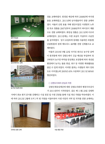 %uc7a5%uc744 %uad50%uccb4%ud558%uc600%ub2e4. %ud55c%uc815%ub41c %uc608%uc0b0%uc5d0 %ub530%ub77c 2008%ub144%uc5d0 %uc5ec%uc0ac%uc0dd%uc6a9%uc744 %uad50%uccb4%ud558%uc600%uace0, 2011%ub144%uc5d0 %ub0a8%uc0ac%uc0dd%uc6a9%uae4c%uc9c0 %uc804%ub7c9 %uad50%uccb4%ud558%uc600%ub2e4. %uc544%uc6b8%ub7ec %ub09c%ubc29 %ud6a8%uc728 %uc800%ud574 %uc6d0%uc778%uc774%uc5c8%ub358 %uc0ac%uc0dd%ubc29%uc758 %ub178%ud6c4%ub41c %ubaa9%uc870 %ucc3d%ud2c0%uc744 2007%ub144%ubd80%ud130 2008%ub144%uae4c%uc9c0 %ud558%uc774%uc0f7%uc2dc %uc81c%ud488%uc73c%ub85c %uc804%ub7c9 %uad50%uccb4%ud558%uc600%ub2e4. %ud654%uc7a5%uc2e4 %ucc3d%ud2c0%uc740 2011%ub144%uc5d0 %uc774%ub974%ub7ec %uad50%uccb4%ub418%uc5c8%ub2e4. 2011%ub144%uc5d0%ub294 %uc0ac%uc0dd %ud638%uc2e4%uc758 %uac70%uc2e4%ub9c8%ub2e4 %uc218%ub0a9%uc7a5%uc744 %uc124%uce58%ud558%uc600%ub2e4. %ub2f9%uc2dc %uc720%uc77c%ud558%uac8c %uce68%ub300%ub97c %uc0ac%uc6a9%ud558%ub358 %ub77c%ub3d9(%ud604 %ub09c%uc124%ud5cc%uad00)%uc758 %uce68%ub300 %ub9e4%ud2b8%ub9ac%uc2a4 48%uac1c%ub97c %uc804%ub7c9 %uc2e0%uc81c%ud488%uc73c%ub85c %uad50%uccb4%ud558%uc600%ub2e4.%uc544%uc6b8%ub7ec 2010%ub144 9%uc6d4 22%uc77c %uad6d%uc9c0%uc131 %ud3ed%uc6b0%ub85c %ub18d%uad6c%uc7a5 %uc639%ubcbd%uc774 %ubd95%uad34%ub428%uc5d0 %ub530%ub77c %uac15%uc6d0%ub3c4%uc5d0%uc11c %uae34%uae09 %uc608%uc0b0%uc744 %ud22c%uc785%ud558%uc5ec %ubcf5%uad6c%ud558%uba74%uc11c %ub18d%uad6c%uc7a5 %ubc14%ub2e5%uc744 %ud0c4%uc131%uc7ac%ub85c %ud3ec%uc7a5%ud568%uc5d0 %ub530%ub77c %uac1c%uc120%ub41c %ud658%uacbd%uc5d0%uc11c %ub18d%uad6c%ub294 %ubb3c%ub860 %ud48b%uc0b4, %uc871%uad6c %ub4f1 %ub2e4%uc591%ud55c %uccb4%uc721%ud65c%ub3d9%uc744 %uc990%uae38 %uc218 %uc788%uac8c %ub418%uc5c8%ub2e4. %uc774%ub7ec%ud55c %uacb0%uacfc%ub294 %uc0ac%uc0dd%ub4e4%uc758 %uc7ac%uc0ac %ub9cc%uc871%ub3c4%ub85c %uc774%uc5b4%uc84c%ub294%ub370 2005%ub144 65% %uc218%uc900%uc5d0%uc11c 2011%ub144 80%%ub85c %ud5a5%uc0c1%ub418%uc5c8%ub2e4.%u25cb %uac15%uc6d0%ub3c4%uc758%ud68c%uc758 %uad00%uc2ec%uacfc %uc9c0%uc6d0%uac15%uc6d0%uc778%uc7ac%uc721%uc131%uc7ac%ub2e8%uc5d0 %ub300%ud55c %uac15%uc6d0%ub3c4%uc758%ud68c%uc758 %ud589%uc815%uc0ac%ubb34%uac10%uc0ac%uac00 2011%ub144%ubd80%ud130 %uc2dc%uc791%ub418%uc5c8%ub2e4. %uac19%uc740 %ud574 11%uc6d4 23%uc77c %uac15%uc6d0%ud559%uc0ac%uc5d0%uc11c %ucd5c%ucd08 %ud604%uc9c0 %uac10%uc0ac%ub97c %uc9c4%ud589%ud558%uace0 %uc2dc%uc124 %uc810%uac80 %ubc0f %uc0ac%uc0dd %uac04%ub2f4%uc744 %ud1b5%ud574 %uc2dc%uc124 %uac1c%uc120 %uc9c0%uc6d0%uc744 %uc57d%uc18d%ud558%uc600%ub2e4. %uc774%uc5d0 %ub530%ub77c 2012%ub144 2%uc6d4%uc5d0 %ub3c4%ube44 1%uc5b5 %uc6d0 %uc9c0%uc6d0%uc744 %uc774%ub04c%uc5b4%ub0b4%uc5b4 %uc0ac%uc0dd %uc2dd%ub2f9%uc758 %uc2dd%ud0c1 %ubc0f %uc758%uc790%ub97c %uc804%ub7c9 %uad50%uccb4%ud558%ub294 %uace8%ud504 %uc5f0%uc2b5%uc7a5%uce68%ub300 %ub9e4%ud2b8%ub9ac%uc2a4 %uad50%uccb4%ub18d%uad6c%uc7a5 %ud0c4%uc131%uc7ac %ud3ec%uc7a5%ub3c4%ubc30 %ubc0f %uc7a5%ud310 %uad50%uccb4%uc2dd%ub2f9 %ud658%uacbd %uac1c%uc120