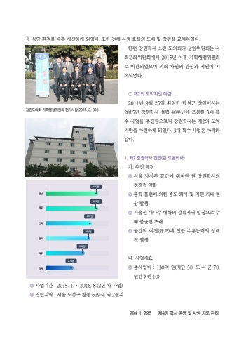 294 |295%uc81c4%uc7a5 %ud559%uc0ac %uc6b4%uc601 %ubc0f %uc0ac%uc0dd %uc9c0%ub3c4 %uad00%ub9ac%ub4f1 %uc2dd%ub2f9 %ud658%uacbd%uc744 %ub300%ud3ed %uac1c%uc120%ud558%uac8c %ub418%uc5c8%ub2e4. %ub610%ud55c %uc804%uccb4 %uc0ac%uc0dd %ud638%uc2e4%uc758 %ub3c4%ubc30 %ubc0f %uc7a5%ud310%uc744 %uad50%uccb4%ud558%uc600%ub2e4.%ud55c%ud3b8 %uac15%uc6d0%ud559%uc0ac %uc18c%uad00 %ub3c4%uc758%ud68c%uc758 %uc0c1%uc784%uc704%uc6d0%ud68c%ub294 %uc0ac%ud68c%ubb38%ud654%uc704%uc6d0%ud68c%uc5d0%uc11c 2015%ub144 %uc774%ud6c4 %uae30%ud68d%ud589%uc815%uc704%uc6d0%ud68c%ub85c %uc774%uad00%ub418%uc5c8%uc73c%uba70 %uc758%ud68c %ucc28%uc6d0%uc758 %uad00%uc2ec%uacfc %uc9c0%uc6d0%uc774 %uc9c0%uc18d%ub418%uc5c8%ub2e4. %u25cb %uc81c2%uc758 %ub3c4%uc57d%uae30%ubc18 %ub9c8%ub8282011%ub144 9%uc6d4 25%uc77c %ucde8%uc784%ud55c %ud568%uc11d%uadfc %uc0c1%uc784%uc774%uc0ac%ub294 2015%ub144 %uac15%uc6d0%ud559%uc0ac %uc124%ub9bd 40%uc8fc%ub144%uc5d0 %uc988%uc74c%ud55c 3%ub300 %ud2b9%uc218 %uc0ac%uc5c5%uc744 %ucd94%uc9c4%ud568%uc73c%ub85c%uc368 %uac15%uc6d0%ud559%uc0ac%ub294 %uc81c2%uc758 %ub3c4%uc57d%uae30%ubc18%uc744 %ub9c8%ub828%ud558%uac8c %ub418%uc5c8%ub2e4. 3%ub300 %ud2b9%uc218 %uc0ac%uc5c5%uc740 %uc544%ub798%uc640 %uac19%ub2e4.1. %uc81c2 %uac15%uc6d0%ud559%uc0ac %uac74%ub9bd(%ud604 %ub3c4%ubd09%ud559%uc0ac)%uac00. %ucd94%uc9c4 %ubc30%uacbd%u25ce%uc11c%uc6b8 %ub0a8%uc11c%ubd80 %ub05d%ub2e8%uc5d0 %uc704%uce58%ud55c %ud604 %uac15%uc6d0%ud559%uc0ac%uc758 %uacbd%uc7c1%ub825 %uc57d%ud654%u25ce%ud1b5%ud559 %ubd88%ud3b8%uc5d0 %uc758%ud55c %uc911%ub3c4 %ud1f4%uc0ac %ubc0f %uc9c0%uc6d0 %uae30%ud53c %ud604%uc0c1 %ubc1c%uc0dd%u25ce%uc11c%uc6b8%uad8c %ub300%ub2e4%uc218 %ub300%ud559%uc758 %uac15%ubd81%uc9c0%uc5ed %ubc00%uc9d1%uc73c%ub85c %uc218%ud61c %ubd88%uade0%ud615 %ucd08%ub798%u25ce%uacf5%uac04%uc801 %uc5ec%uac74(%uaddc%ubaa8)%uc5d0 %uc778%ud55c %uc218%uc6a9%ub2a5%ub825%uc758 %uc0c1%ub300%uc801 %uc5f4%uc138 %ub098. %uc0ac%uc5c5%uac1c%uc694%u25ce%ucd1d%uc0ac%uc5c5%ube44 : 130%uc5b5 %uc6d0(%uc7ac%ub2e8 50, %ub3c4%u00b7%uc2dc%u00b7%uad70 70, %ubbfc%uac04%ud6c4%uc6d0 10)%u25ce %uc0ac%uc5c5%uae30%uac04 : 2015. 1. ~ 2016. 8.(2%ub144 %ucc28 %uc0ac%uc5c5)%u25ce %uac74%ub9bd%uc9c0%uc5ed : %uc11c%uc6b8 %ub3c4%ubd09%uad6c %ucc3d%ub3d9 629-4 %uc678 2%ud544%uc9c0%uac15%uc6d0%ub3c4%uc758%ud68c %uae30%ud68d%ud589%uc815%uc704%uc6d0%ud68c %ud604%uc9c0%uc2dc%ucc30(2015. 3. 30.)%uc804%ub0a8%uad11%uc8fc%uc804%ubd81%ucda9%ubd81%uc81c%uc8fc%uac15%uc6d0425%uba85425%uba85372%uba85356%uba85300%uba85275%uba85