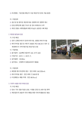 %u25ce %ucd94%uc9c4%ubc29%ubc95 : %uae30%uc874%uac74%ubb3c %ub9e4%uc785 %ud6c4 %uc2dc%uc124 %uac1c%uc120(%uae30%uac04 %ub2e8%ucd95, %ube44%uc6a9 %uc808%uac10)%ub2e4. %uc0ac%uc5c5%uc131%uacfc%u25ce%uc811%uadfc%uc131 %ubc0f %ud3b8%uc758%uc131 %uac1c%uc120%uc5d0 %ub530%ub978 %uac15%uc6d0%ud559%uc0ac%uc758 %uacbd%uc7c1%ub825 %uc81c%uace0%u25ce%ub2e8%uc77c %uad11%uc5ed%ub2e8%uccb4 %uc124%ub9bd %uae30%uc219%uc0ac %uc911 %uc804%uad6d %ucd5c%ub300%uaddc%ubaa8 %ub3c4%uc57d%u25ce%uc7ac%uacbd %uac15%uc6d0%ub3c4 %ub300%ud559%uc0dd%ub4e4%uc5d0 %ub300%ud55c %ud3ed %ub113%uace0 %uade0%ub4f1%ud55c %uc218%ud61c %uc81c%uacf52. %ud0dc%uc591%uad11 %ubc1c%uc804%uc124%ube44 %uc900%uacf5%uac00. %ucd94%uc9c4 %ubc30%uacbd%u25ce %uc815%ubd80 %uc2e0%uc7ac%uc0dd %uc5d0%ub108%uc9c0 %uc7a5%ub824%uc2dc%ucc45 %ubd80%uc751, %uce5c%ud658%uacbd %uc5d0%ub108%uc9c0%uc0ac%uc6a9%u25ce%uc5d0%ub108%uc9c0%ube44%uc6a9 %uc808%uac10 %ub4f1 %uc5d0%ub108%uc9c0 %ud6a8%uc728%uc131 %uc81c%uace0 2015 %uc815%ubd80 %uc2e0%uc7ac%uc0dd%uc5d0%ub108%uc9c0 %uc9c0%uc5ed%uc9c0%uc6d0%uc0ac%uc5c5 %ub300%uc0c1%uae30%uad00 %uc120%uc815%ub098. %uc0ac%uc5c5%uac1c%uc694%u25ce %ucd1d%uc0ac%uc5c5%ube44 : 320%ubc31%ub9cc %uc6d0(%uad6d%ube44 160, %ub3c4%ube44 160)%u25ce %uc0ac%uc5c5%uae30%uac04 : 2015. 1.~2015. 5.%u25ce %uc124%uce58%uc6a9%ub7c9 : 100.8kw%u25ce %uc124%uce58%uc7a5%uc18c : %uac15%uc6d0%ud559%uc0ac %uc77c%uc6d0(%uc720%ud734%ubd80%uc9c0 %ud65c%uc6a9)%ub2e4. %uc0ac%uc5c5%uc131%uacfc%u25ce %ud0dc%uc591%uad11 %uc5d0%ub108%uc9c0(%uc804%ub825) %uc0dd%uc0b0 : %uc5f0%uac04 %ucd5c%ub300 146,520kwh%u25ce %uc5d0%ub108%uc9c0%ube44%uc6a9 %uc808%uac10 : %uc5f0%uac04 %ucd5c%ub300 17,000%ucc9c %uc6d0%u25ce %uc774%uc0b0%ud654%ud0c4%uc18c %ubc30%ucd9c %uc5b5%uc81c : %uc5f0%uac04 68.9tco23. %ub2e4%ubaa9%uc801 %uc0ac%uc6a9%uc744 %uc704%ud55c %ubbf8%ub798%uad00 %uc900%uacf5%uac00. %ucd94%uc9c4 %ubc30%uacbd%u25ce %ub2f9%ucd08 %uae30%uc219 %uc804%uc6a9%uc2dc%uc124%ub85c %uc900%uacf5, %uc0ac%uc0dd%uc6a9 %uac15%ub2f9 %ub4f1 %uad50%uc721%uc2dc%uc124 %ucde8%uc57d%u25ce %uc7ac%ub2e8%uc5c5%ubb34%uc758 %ud6a8%uc728%uc801 %uc9c1%ubb34%uc218%ud589%uc744 %uc704%ud55c %ub2e4%ubaa9%uc801 %ud65c%uc6a9%uacf5%uac04 %ud544%uc694