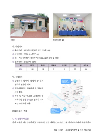 296 |297%uc81c4%uc7a5 %ud559%uc0ac %uc6b4%uc601 %ubc0f %uc0ac%uc0dd %uc9c0%ub3c4 %uad00%ub9ac%ub098. %uc0ac%uc5c5%uac1c%uc694%u25ce %ucd1d%uc0ac%uc5c5%ube44 : 550%ubc31%ub9cc %uc6d0(%uc7ac%ub2e8 200, %ub3c4%ube44 350)%u25ce %uc0ac%uc5c5%uae30%uac04 : 2014. 6.~2015. 6.%u25ce%uc704 %uce58 : %uac15%uc6d0%ud559%uc0ac %uc720%ud734%ubd80%uc9c0(%uc9c4%uc785%ub85c %uce21%uba74 %uacf5%ud130 %ubc0f %uc815%uc6d0)%u25ce %uac74%ucd95%uaddc%ubaa8 : 274%u33a1(%uc57d 83%ud3c9)%uacc4%uac15 %ub2f9%ubb34 %ub300%ubc29%uc1a1%uc2e4%ub300%uae30%uc2e4%ucc3d%uace0%ud654%uc7a5%uc2e427418014782045%ub2e4. %uc0ac%uc5c5%uc131%uacfc%u25ce%uac15%uc6d0%ud559%uc0ac %uc785%uc0ac%uc2dd, %uc878%uc5c5%uc2dd %ub4f1 %uc8fc%uc694 %ud589%uc0ac%uc758 %uc6d0%ud65c%ud55c %uac1c%ucd5c%u25ce%ud589%uc815%uc0ac%ubb34%uac10%uc0ac, %uc7ac%ubb34%uac10%uc0ac %ub4f1 %uc678%ubd80 %uac10%uc0ac%uc7a5 %ud65c%uc6a9%u25ce%uc9c1%uc6d0 %ubc0f %uc0ac%uc0dd %uc6cc%ud06c%uc20d, %uad50%uc591%uac15%uc88c %ub4f1 %uad50%uc721%uc2dc%uc124 %ud65c%uc6a9 %uc900%uacf5 %uc804%uae4c%uc9c0 %ub85c%ube44 %ub610%ub294 %uad6c%ub0b4%uc2dd%ub2f9 %uc0ac%uc6a9(3) 2016%ub144 ~ %ud604%uc7ac%u25cb %uc81c2 %uac15%uc6d0%ud559%uc0ac %uc6b4%uc601%uc55e%uc11c %uc11c%uc220%ud55c %uc81c2 %uac15%uc6d0%ud559%uc0ac(%ud604 %ub3c4%ubd09%ud559%uc0ac) %uac74%ub9bd %uacc4%ud68d%uc740 2014%ub144 12%uc6d4 %uc815%uae30%uc774%uc0ac%ud68c%uc5d0%uc11c %ud655%uc815%ub418%uc5c8%ub2e4. %ubbf8%ub798%uad00%ubbf8%ub798%uad00 %ub2e4%ubaa9%uc801 %ud65c%uc6a9