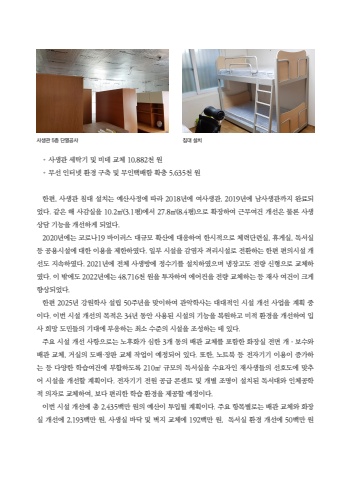 %u25e6 %uc0ac%uc0dd%uad00 %uc138%ud0c1%uae30 %ubc0f %ube44%ub370 %uad50%uccb4 10,882%ucc9c %uc6d0%u25e6 %ubb34%uc120 %uc778%ud130%ub137 %ud658%uacbd %uad6c%ucd95 %ubc0f %ubb34%uc778%ud0dd%ubc30%ud568 %ud655%ucda9 5,635%ucc9c %uc6d0%ud55c%ud3b8, %uc0ac%uc0dd%uad00 %uce68%ub300 %uc124%uce58%ub294 %uc608%uc0b0%uc0ac%uc815%uc5d0 %ub530%ub77c 2018%ub144%uc5d0 %uc5ec%uc0ac%uc0dd%uad00, 2019%ub144%uc5d0 %ub0a8%uc0ac%uc0dd%uad00%uae4c%uc9c0 %uc644%ub8cc%ub418%uc5c8%ub2e4. %uac19%uc740 %ud574 %uc0ac%uac10%uc2e4%uc744 10.2%u33a1(3.1%ud3c9)%uc5d0%uc11c 27.8%u33a1(8.4%ud3c9)%uc73c%ub85c %ud655%uc7a5%ud558%uc5ec %uadfc%ubb34%uc5ec%uac74 %uac1c%uc120%uc740 %ubb3c%ub860 %uc0ac%uc0dd %uc0c1%ub2f4 %uae30%ub2a5%uc744 %uac1c%uc120%ud558%uac8c %ub418%uc5c8%ub2e4.2020%ub144%uc5d0%ub294 %ucf54%ub85c%ub09819 %ubc14%uc774%ub7ec%uc2a4 %ub300%uaddc%ubaa8 %ud655%uc0b0%uc5d0 %ub300%uc751%ud558%uc5ec %ud55c%uc2dc%uc801%uc73c%ub85c %uccb4%ub825%ub2e8%ub828%uc2e4, %ud734%uac8c%uc2e4, %ub3c5%uc11c%uc2e4 %ub4f1 %uacf5%uc6a9%uc2dc%uc124%uc5d0 %ub300%ud55c %uc774%uc6a9%uc744 %uc81c%ud55c%ud558%uc600%ub2e4. %uc77c%ubd80 %uc2dc%uc124%uc744 %uac10%uc5fc%uc790 %uaca9%ub9ac%uc2dc%uc124%ub85c %uc804%ud658%ud558%ub294 %ud55c%ud3b8 %ud3b8%uc758%uc2dc%uc124 %uac1c%uc120%ub3c4 %uc9c0%uc18d%ud558%uc600%ub2e4. 2021%ub144%uc5d0 %uc804%uccb4 %uc0ac%uc0dd%ubc29%uc5d0 %uc815%uc218%uae30%ub97c %uc124%uce58%ud558%uc600%uc73c%uba70 %ub0c9%uc7a5%uace0%ub3c4 %uc804%ub7c9 %uc2e0%ud615%uc73c%ub85c %uad50%uccb4%ud558%uc600%ub2e4. %uc774 %ubc16%uc5d0%ub3c4 2022%ub144%uc5d0%ub294 48,716%ucc9c %uc6d0%uc744 %ud22c%uc790%ud558%uc5ec %uc5d0%uc5b4%ucee8%uc744 %uc804%ub7c9 %uad50%uccb4%ud558%ub294 %ub4f1 %uc7ac%uc0ac %uc5ec%uac74%uc774 %ud06c%uac8c %ud5a5%uc0c1%ub418%uc5c8%ub2e4.%ud55c%ud3b8 2025%ub144 %uac15%uc6d0%ud559%uc0ac %uc124%ub9bd 50%uc8fc%ub144%uc744 %ub9de%uc774%ud558%uc5ec %uad00%uc545%ud559%uc0ac%ub294 %ub300%ub300%uc801%uc778 %uc2dc%uc124 %uac1c%uc120 %uc0ac%uc5c5%uc744 %uacc4%ud68d %uc911%uc774%ub2e4. %uc774%ubc88 %uc2dc%uc124 %uac1c%uc120%uc758 %ubaa9%uc801%uc740 34%ub144 %ub3d9%uc548 %uc0ac%uc6a9%ub41c %uc2dc%uc124%uc758 %uae30%ub2a5%uc744 %ubcf5%uc6d0%ud558%uace0 %ubbf8%uc801 %ud658%uacbd%uc744 %uac1c%uc120%ud558%uc5ec %uc785%uc0ac %ud76c%ub9dd %ub3c4%ubbfc%ub4e4%uc758 %uae30%ub300%uc5d0 %ubd80%uc751%ud558%ub294 %ucd5c%uc18c %uc218%uc900%uc758 %uc2dc%uc124%uc744 %uc870%uc131%ud558%ub294 %ub370 %uc788%ub2e4.%uc8fc%uc694 %uc2dc%uc124 %uac1c%uc120 %uc0ac%ud56d%uc73c%ub85c%ub294 %ub178%ud6c4%ud654%uac00 %uc2ec%ud55c 3%uac1c %ub3d9%uc758 %ubc30%uad00 %uad50%uccb4%ub97c %ud3ec%ud568%ud55c %ud654%uc7a5%uc2e4 %uc804%uba74 %uac1c%u318d%ubcf4%uc218%uc640 %ubc30%uad00 %uad50%uccb4, %uac70%uc2e4%uc758 %ub3c4%ubc30%u00b7%uc7a5%ud310 %uad50%uccb4 %uc791%uc5c5%uc774 %uc608%uc815%ub418%uc5b4 %uc788%ub2e4. %ub610%ud55c, %ub178%ud2b8%ubd81 %ub4f1 %uc804%uc790%uae30%uae30 %uc774%uc6a9%uc774 %uc99d%uac00%ud558%ub294 %ub4f1 %ub2e4%uc591%ud55c %ud559%uc2b5%uc5ec%uac74%uc5d0 %ubd80%ud569%ud558%ub3c4%ub85d 210%u33a1 %uaddc%ubaa8%uc758 %ub3c5%uc11c%uc2e4%uc744 %uc218%uc694%uc790%uc778 %uc7ac%uc0ac%uc0dd%ub4e4%uc758 %uc120%ud638%ub3c4%uc5d0 %ub9de%ucd94%uc5b4 %uc2dc%uc124%uc744 %uac1c%uc120%ud560 %uacc4%ud68d%uc774%ub2e4. %uc804%uc790%uae30%uae30 %uc804%uc6d0 %uacf5%uae09 %ucf58%uc13c%ud2b8 %ubc0f %uac1c%ubcc4 %uc870%uba85%uc774 %uc124%uce58%ub41c %ub3c5%uc11c%ub300%uc640 %uc778%uccb4%uacf5%ud559%uc801 %uc758%uc790%ub85c %uad50%uccb4%ud558%uc5ec, %ubcf4%ub2e4 %ud3b8%ub9ac%ud55c %ud559%uc2b5 %ud658%uacbd%uc744 %uc81c%uacf5%ud560 %uc608%uc815%uc774%ub2e4.%uc774%ubc88 %uc2dc%uc124 %uac1c%uc120%uc5d0 %ucd1d 2,435%ubc31%ub9cc %uc6d0%uc758 %uc608%uc0b0%uc774 %ud22c%uc785%ub420 %uacc4%ud68d%uc774%ub2e4. %uc8fc%uc694 %ud56d%ubaa9%ubcc4%ub85c%ub294 %ubc30%uad00 %uad50%uccb4%uc640 %ud654%uc7a5%uc2e4 %uac1c%uc120%uc5d0 2,193%ubc31%ub9cc %uc6d0, %uc0ac%uc0dd%uc2e4 %ubc14%ub2e5 %ubc0f %ubcbd%uc9c0 %uad50%uccb4%uc5d0 192%ubc31%ub9cc %uc6d0, %ub3c5%uc11c%uc2e4 %ud658%uacbd %uac1c%uc120%uc5d0 50%ubc31%ub9cc %uc6d0%uc0ac%uc0dd%uad00 5%uce35 %ub2e8%uc5f4%uacf5%uc0ac%uce68%ub300 %uc124%uce58