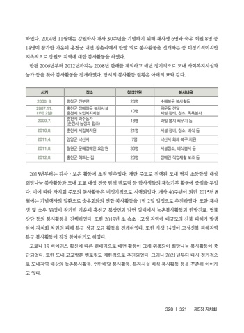 320 |321%uc81c5%uc7a5 %uc790%uce58%ud68c%ud558%uc600%ub2e4. 2004%ub144 11%uc6d4%uc5d0%ub294 %uac15%uc6d0%ud559%uc0ac %uac1c%uc0ac 30%uc8fc%ub144%uc744 %uae30%ub150%ud558%uae30 %uc704%ud574 %uc7ac%uc0ac%uc0dd 6%uba85%uacfc %uc219%uc6b0 %ud68c%uc6d0 8%uba85 %ub4f1 14%uba85%uc774 %ucc38%uac00%ud55c %uac00%uc6b4%ub370 %ud64d%ucc9c%uad70 %ub0b4%uba74 %ucc3d%ucd0c%ub9ac%uc5d0%uc11c %ud55c%ubc29 %uc758%ub8cc %ubd09%uc0ac%ud65c%ub3d9%uc744 %uc804%uac1c%ud558%ub294 %ub4f1 %ube44%uc815%uae30%uc801%uc774%uc9c0%ub9cc %uc9c0%uc18d%uc801%uc73c%ub85c %uac15%uc6d0%ub3c4 %uc9c0%uc5ed%uc5d0 %ub300%ud55c %ubd09%uc0ac%ud65c%ub3d9%uc744 %ud558%uc600%ub2e4.%ud55c%ud3b8 2006%ub144%ubd80%ud130 2012%ub144%uae4c%uc9c0%ub294 2008%ub144 %ud55c%ud574%ub97c %uc81c%uc678%ud558%uace0 %ub9e4%ub144 %uc815%uae30%uc801%uc73c%ub85c %ub3c4%ub0b4 %uc0ac%ud68c%ubcf5%uc9c0%uc2dc%uc124%uacfc %ub18d%uac00 %ub4f1%uc744 %ucc3e%uc544 %ubd09%uc0ac%ud65c%ub3d9%uc744 %uc804%uac1c%ud558%uc600%ub2e4. %ub2f9%uc2dc%uc758 %ubd09%uc0ac%ud65c%ub3d9 %ud604%ud669%uc740 %uc544%ub798%uc758 %ud45c%uc640 %uac19%ub2e4.%uc2dc%uae30%uc7a5%uc18c%ucc38%uc11d%uc778%uc6d0%ubd09%uc0ac%ub0b4%uc6a92006. 8.%ud3c9%ucc3d%uad70 %uc9c4%ubd80%uba7426%uba85%uc218%ud574%ubcf5%uad6c %ubd09%uc0ac%ud65c%ub3d92007.11.(1%ubc15 2%uc77c)%ud64d%ucc9c%uad70 %uc7a5%uc560%uc544%ub3d9 %ubcf5%uc9c0%uc2dc%uc124%ucd98%ucc9c%uc2dc %ub178%uc778%ubcf5%uc9c0%uc2dc%uc12410%uba85%uc704%ubb38%ud488 %uc804%ub2ec%uc2dc%uc124 %uc815%ube44, %uccad%uc18c, %ubaa9%uc695%ubd09%uc0ac2009.7.%ucd98%ucc9c%uc2dc %uacfc%uc218%ub18d%uac00(%ucd98%ucc9c%uc2dc %ub18d%uc815%uacfc %ud611%uc870)18%uba85%uacfc%uc77c %ubd09%uc9c0 %uc50c%uc6b0%uae30 %ub4f12010.8.%ucd98%ucc9c%uc2dc %uc2dc%ub9bd%ubcf5%uc9c0%uc6d021%uba85%uc2dc%uc124 %uc815%ube44, %uccad%uc18c, %ubc30%uc2dd %ub4f12011.4.%uc591%uc591%uad70 %ub099%uc0b0%uc0ac7%uba85%ub099%uc0b0%uc0ac %ud654%uc7ac %ubcf5%uad6c %uc9c0%uc6d02011.8.%ucca0%uc6d0%uad70 %ubb38%ud61c%uc7a5%uc560%uc778 %uc694%uc591%uc6d030%uba85%uc2dc%uc124%uccad%uc18c, %ubc30%uc2dd%ubd09%uc0ac %ub4f12012.8.%ud64d%ucc9c%uad70 %ud574%ub728%ub294 %uc9d120%uba85%uc7a5%uc560%uc778 %uc9c1%uc5c5%uc7ac%ud65c %ubcf4%uc870 %ub4f12013%ub144%ubd80%ud130%ub294 %uac10%uc0ac %u302e %ubcf4%uc740 %ud65c%ub3d9%uc5d0 %ucd08%uc810 %ub9de%ucd94%uc5c8%ub2e4. %uc7ac%ub2e8 %uc8fc%ub3c4%ub85c %uc9c4%ud589%ub41c %ub3c4%ub0b4 %ubcbd%uc9c0 %ucd08%ub4f1%ud559%uc0dd %ub300%uc0c1 %ud76c%ub9dd%ub098%ub214 %ubd09%uc0ac%ud65c%ub3d9%uacfc %ub3c4%ub0b4 %uace0%uad50 %ub300%uc0c1 %uc804%uacf5 %ud0d0%uc0c9 %uba58%ud1a0%ub9c1 %ub4f1 %ud559%uc0ac%uc0dd%ub4e4%uc758 %uc7ac%ub2a5%uae30%ubd80 %ud65c%ub3d9%uc5d0 %uc911%uc810%uc744 %ub450%uc5c8%ub2e4. %uc774%uc5d0 %ub530%ub77c %uc790%uce58%ud68c %uc8fc%ub3c4%uc758 %ubd09%uc0ac%ud65c%ub3d9%uc740 %ube44%uc815%uae30%uc801%uc73c%ub85c %uc2dc%ud589%ub418%uc5c8%ub2e4. %uac1c%uc0ac 40%uc8fc%ub144%uc774 %ub418%ub358 2015%ub144 8%uc6d4%uc5d0%ub294 %uae30%ub150%ud589%uc0ac%uc758 %uc77c%ud658%uc73c%ub85c %uc219%uc6b0%ud68c%uc640%uc758 %uc5f0%ud569 %ubd09%uc0ac%ud65c%ub3d9%uc744 1%ubc15 2%uc77c %uc77c%uc815%uc73c%ub85c %ucd94%uc9c4%ud558%uc600%ub2e4. %ub610%ud55c %uc7ac%uc0ac%uc0dd %ubc0f %uc219%uc6b0 38%uba85%uc774 %ucc38%uac00%ud55c %uac00%uc6b4%ub370 %ud64d%ucc9c%uad70 %ubd81%ubc29%uba74%uacfc %ub0a8%uba74 %uc77c%ub300%uc5d0%uc11c %ub18d%ucd0c%ubd09%uc0ac%ud65c%ub3d9%uacfc %ud55c%ubc29%uc9c4%ub8cc, %ubc95%ub960%uc0c1%ub2f4 %ub4f1%uc758 %ubd09%uc0ac%ud65c%ub3d9%uc744 %uc9c4%ud589%ud558%uc600%ub2e4. %ub610%ud55c 2019%ub144 %ucd08 %uc18d%ucd08%u318d%uace0%uc131 %uc9c0%uc5ed%uc5d0 %ub300%uaddc%ubaa8%uc758 %uc0b0%ubd88 %ud53c%ud574%uac00 %ubc1c%uc0dd%ud558%uc5ec %uc790%uce58%ud68c %ucc28%uc6d0%uc758 %ud53c%ud574 %ubcf5%uad6c %uc131%uae08 %ubaa8%uae08 %ud65c%ub3d9%uc744 %uc804%uac1c%ud558%uc600%ub2e4. %ub610%ud55c %uc0ac%uc0dd 14%uba85%uc774 %uace0%uc131%uc0b0%ubd88 %ud53c%ud574%uc9c0%uc5ed %ubcf5%uad6c %ubd09%uc0ac%ud65c%ub3d9%uc5d0 %uc9c1%uc811 %ucc38%uc5ec%ud558%uae30%ub3c4 %ud558%uc600%ub2e4.%ucf54%ub85c%ub098 19 %ubc14%uc774%ub7ec%uc2a4 %ud655%uc0b0%uc5d0 %ub530%ub978 %ud32c%ub370%ubbf9%uc73c%ub85c %ub300%uba74 %ud65c%ub3d9%uc774 %ud06c%uac8c %uc704%ucd95%ub418%uc5b4 %ud76c%ub9dd%ub098%ub214 %ubd09%uc0ac%ud65c%ub3d9%uc774 %uc911%ub2e8%ub418%uc5c8%ub2e4. %ub610%ud55c %ub3c4%ub0b4 %uace0%uad50%ubc29%ubb38 %uba58%ud1a0%ub9c1%ub3c4 %uc81c%ud55c%uc801%uc73c%ub85c %ucd94%uc9c4%ub418%uc5c8%ub2e4. %uadf8%ub7ec%ub098 2021%ub144%ubd80%ud130 %ub2e4%uc2dc %uc815%uae30%uc801%uc73c%ub85c %ub3c4%ub0b4%uc9c0%uc5ed %ub300%uc0c1%uc758 %ub18d%ucd0c%ubd09%uc0ac%ud65c%ub3d9, %uc5f0%ud0c4%ubc30%ub2ec %ubd09%uc0ac%ud65c%ub3d9, %ubcf5%uc9c0%uc2dc%uc124 %ubc30%uc2dd %ubd09%uc0ac%ud65c%ub3d9 %ub4f1%uc744 %uafb8%uc900%ud788 %uc774%uc5b4%uac00%uace0 %uc788%ub2e4.