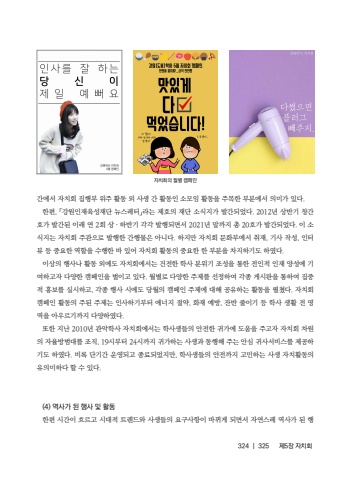 324 |325%uc81c5%uc7a5 %uc790%uce58%ud68c%uac04%uc5d0%uc11c %uc790%uce58%ud68c %uc9d1%ud589%ubd80 %uc704%uc8fc %ud65c%ub3d9 %uc678 %uc0ac%uc0dd %uac04 %ud65c%ub3d9%uc778 %uc18c%ubaa8%uc784 %ud65c%ub3d9%uc744 %uc8fc%ubaa9%ud55c %ubd80%ubd84%uc5d0%uc11c %uc758%ubbf8%uac00 %uc788%ub2e4.%ud55c%ud3b8, %u300c%uac15%uc6d0%uc778%uc7ac%uc721%uc131%uc7ac%ub2e8 %ub274%uc2a4%ub808%ud130%u300d%ub77c%ub294 %uc81c%ud638%uc758 %uc7ac%ub2e8 %uc18c%uc2dd%uc9c0%uac00 %ubc1c%uac04%ub418%uc5c8%ub2e4. 2012%ub144 %uc0c1%ubc18%uae30 %ucc3d%uac04%ud638%uac00 %ubc1c%uac04%ub41c %uc774%ub798 %uc5f0 2%ud68c %uc0c1 %u302e %ud558%ubc18%uae30 %uac01%uac01 %ubc1c%ud589%ub418%uba74%uc11c 2021%ub144 %ub9d0%uae4c%uc9c0 %ucd1d 20%ud638%uac00 %ubc1c%uac04%ub418%uc5c8%ub2e4. %uc774 %uc18c%uc2dd%uc9c0%ub294 %uc790%uce58%ud68c %uc8fc%uad00%uc73c%ub85c %ubc1c%ud589%ud55c %uac04%ud589%ubb3c%uc740 %uc544%ub2c8%ub2e4. %ud558%uc9c0%ub9cc %uc790%uce58%ud68c %ubb38%ud654%ubd80%uc5d0%uc11c %ucde8%uc7ac, %uae30%uc0ac %uc791%uc131, %uc778%ud130%ubdf0 %ub4f1 %uc911%uc694%ud55c %uc5ed%ud560%uc744 %uc218%ud589%ud55c %ubc14 %uc788%uc5b4 %uc790%uce58%ud68c %ud65c%ub3d9%uc758 %uc911%uc694%ud55c %ud55c %ubd80%ubd84%uc744 %ucc28%uc9c0%ud558%uae30%ub3c4 %ud558%uc600%ub2e4.%uc774%uc0c1%uc758 %ud589%uc0ac%ub098 %ud65c%ub3d9 %uc678%uc5d0%ub3c4 %uc790%uce58%ud68c%uc5d0%uc11c%ub294 %uac74%uc804%ud55c %ud559%uc0ac %ubd84%uc704%uae30 %uc870%uc131%uc744 %ud1b5%ud55c %uc804%uc778%uc801 %uc778%uc7ac %uc591%uc131%uc5d0 %uae30%uc5ec%ud558%uace0%uc790 %ub2e4%uc591%ud55c %ucea0%ud398%uc778%uc744 %ubc8c%uc774%uace0 %uc788%ub2e4. %uc6d4%ubcc4%ub85c %ub2e4%uc591%ud55c %uc8fc%uc81c%ub97c %uc120%uc815%ud558%uc5ec %uac01%uc885 %uac8c%uc2dc%ud310%uc744 %ud1b5%ud558%uc5ec %uc9d1%uc911%uc801 %ud64d%ubcf4%ub97c %uc2e4%uc2dc%ud558%uace0, %uac01%uc885 %ud589%uc0ac %uc2dc%uc5d0%ub3c4 %ub2f9%uc6d4%uc758 %ucea0%ud398%uc778 %uc8fc%uc81c%uc5d0 %ub300%ud574 %uacf5%uc720%ud558%ub294 %ud65c%ub3d9%uc744 %ud3bc%ucce4%ub2e4. %uc790%uce58%ud68c %ucea0%ud398%uc778 %ud65c%ub3d9%uc758 %uc8fc%ub41c %uc8fc%uc81c%ub294 %uc778%uc0ac%ud558%uae30%ubd80%ud130 %uc5d0%ub108%uc9c0 %uc808%uc57d, %ud654%uc7ac %uc608%ubc29, %uc794%ubc18 %uc904%uc774%uae30 %ub4f1 %ud559%uc0ac %uc0dd%ud65c %uc804 %uc601%uc5ed%uc744 %uc544%uc6b0%ub974%uae30%uae4c%uc9c0 %ub2e4%uc591%ud558%uc600%ub2e4.%ub610%ud55c %uc9c0%ub09c 2010%ub144 %uad00%uc545%ud559%uc0ac %uc790%uce58%ud68c%uc5d0%uc11c%ub294 %ud559%uc0ac%uc0dd%ub4e4%uc758 %uc548%uc804%ud55c %uadc0%uac00%uc5d0 %ub3c4%uc6c0%uc744 %uc8fc%uace0%uc790 %uc790%uce58%ud68c %ucc28%uc6d0%uc758 %uc790%uc728%ubc29%ubc94%ub300%ub97c %uc870%uc9c1, 19%uc2dc%ubd80%ud130 24%uc2dc%uae4c%uc9c0 %uadc0%uac00%ud558%ub294 %uc0ac%uc0dd%uacfc %ub3d9%ud589%ud574 %uc8fc%ub294 %uc548%uc2ec %uadc0%uc0ac%uc11c%ube44%uc2a4%ub97c %uc81c%uacf5%ud558%uae30%ub3c4 %ud558%uc600%ub2e4. %ube44%ub85d %ub2e8%uae30%uac04 %uc6b4%uc601%ub418%uace0 %uc885%ub8cc%ub418%uc5c8%uc9c0%ub9cc, %ud559%uc0ac%uc0dd%ub4e4%uc758 %uc548%uc804%uae4c%uc9c0 %uace0%ubbfc%ud558%ub294 %uc0ac%uc0dd %uc790%uce58%ud65c%ub3d9%uc758 %uc720%uc758%ubbf8%ud558%ub2e4 %ud560 %uc218 %uc788%ub2e4.(4) %uc5ed%uc0ac%uac00 %ub41c %ud589%uc0ac %ubc0f %ud65c%ub3d9 %ud55c%ud3b8 %uc2dc%uac04%uc774 %ud750%ub974%uace0 %uc2dc%ub300%uc801 %ud2b8%ub80c%ub4dc%uc640 %uc0ac%uc0dd%ub4e4%uc758 %uc694%uad6c%uc0ac%ud56d%uc774 %ubc14%ub00c%uac8c %ub418%uba74%uc11c %uc790%uc5f0%uc2a4%ub808 %uc5ed%uc0ac%uac00 %ub41c %ud589%uc790%uce58%ud68c%uc758 %uc6d4%ubcc4 %ucea0%ud398%uc778