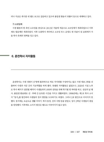 326 |327%uc81c5%uc7a5 %uc790%uce58%ud68c%ub7ec%ub098 %uc9c0%uae08%uc740 %uac8c%uc2dc%ud310 %ub0b4 %ubcc4%ub3c4 %ubcf4%uace0%ub85c %uac08%uc74c%ud558%uace0 %uc788%uc73c%uba70 %uc878%uc5c5%uc0dd %ud658%uc1a1%uc2dd %ub4a4%ud480%uc774 %ub4f1%uc73c%ub85c %ub300%uccb4%ud558%uace0 %uc788%ub2e4.7) %uc18c%ubaa8%uc784%uc81c %uc0ac%uc0dd %ud65c%ub3d9%uc758 %ud55c %ucd95%uc778 %uc18c%ubaa8%uc784%uc744 %uc911%uc2ec%uc73c%ub85c 2012%ub144 %uac00%uc744%uc5d0 %ucc98%uc74c%uc73c%ub85c %uc18c%ubaa8%uc784%uc81c%uac00 %uac1c%ucd5c%ub418%uc5c8%uc73c%ub098 %uc774%ud6c4 %uacc4%uc18d %uc5f4%uc74c%uc81c%ub9cc %uac1c%ucd5c%ub418%uc5c8%ub2e4. %uc774%ud6c4 %ub3c4%ubd09%ud559%uc0ac %uac1c%uc0ac%ud558%uace0 %uc18c%ubaa8%uc784 %ubd80%uc2a4 %uc6b4%uc601%ub3c4 %ud55c %ubd80%ubd84%uc774 %ub41c %ubb38%ud654%uc81c%uac00 %uac00%uc744 %ud559%uc0ac %ucd95%uc81c%uc758 %uba85%ub9e5%uc744 %uc787%uace0 %uc788%ub2e4. %ucd98%ucc9c%ud559%uc0ac%ub294 %uc0ac%uc0dd %uc815%uc6d0%uc774 37%uba85%uc5d0 %ubd88%uacfc%ud558%ubbc0%ub85c %ub530%ub85c %uc790%uce58%ud68c%ub97c %uad6c%uc131%ud558%uc9c0%ub294 %uc54a%uace0 %uc0ac%uc0dd %ub300%ud45c 2%uba85%uc744 %uc120%ucd9c%ud558%uc5ec %uc0ac%uc0dd%uacfc %uc0ac%uac10 %uac04%uc758 %uac00%uad50%uc5ed%ud560%uc744 %ud558%uac8c %ud588%ub2e4. %ud2b9%ubcc4%ud55c %uc790%uce58%ud65c%ub3d9%uc740 %uc5c6%uc5c8%uc73c%ub098, 2020%ub144 %uc2dc%uc124 %ub178%ud6c4%ub85c %ud559%uc0ac %ud3d0%uc9c0%uac00 %uacb0%uc815%ub420 %ub54c%uae4c%uc9c0 %uc0ac%uc0dd%ub4e4%uacfc%uc758 %uad50%ub958%uc640 %uce5c%ubaa9%uc744 %uc704%ud574 %ud559%uae30%ubcc4 %ubc29 %ud30c%ud2f0%ub97c %ud558%uace0, %uc131%ub144%uc758 %ub0a0 %ud589%uc0ac, %uc878%uc5c5%uc0dd %ud658%uc1a1%ud68c%ub85c %uc120 %u302e %ud6c4%ubc30 %uac04 %ub3c8%ub3c5%ud55c %uc2dc%uac04%uc744 %uac00%uc9c0%uace0 %uc0dd%ud65c%ud558%uc600%ub2e4. 1998%ub144%uc5d0%ub294 %uc81c1%ud638 %ud559%uc0ac %uc18c%uc2dd%uc9c0 %u300c%ub465%uc9c0%u300d%ub97c %ubc1c%uac04%ud558%uc5ec %uc0ac%uc0dd%ub4e4%uc758 %uc815%uc11c %ud568%uc591%uc744 %ub3c4%ubaa8%ud558%uae30%ub3c4 %ud558%uc600%ub2e4. %uadf8%ub7ec%ub098 2%ud638 %ubc1c%uac04%uc73c%ub85c %uc774%uc5b4%uc9c0%uc9c0 %ubabb%ud588%ub2e4. %ub465%uc9c0%uc5d0%ub294 %uc624%uc21c%ub3c4%uc21c %uc0dd%ud65c %uc774%uc57c%uae30, %ud559%uc0ac %ub3d9%uc815, %uac74%uc758 %uc0ac%ud56d %ub4f1%uc744 %ub2f4%uc558%uace0, %ub2f9%uc2dc 2%ud559%ub144 %uc0ac%uc0dd%ub4e4%uc774 %ud3b8%uc9d1%uc744 %ub2f4%ub2f9%ud588%ub2e4. %uc774%ud6c4%uc5d0%ub3c4 %uc18c%uc2dd%uc9c0 %ubc1c%uac04%uc740 %ubcc4%ub3c4%ub85c %uc774%ub8e8%uc5b4%uc9c0%uc9c0 %uc54a%uace0 %uc788%ub2e4. 6. %ucd98%ucc9c%ud559%uc0ac %uc790%uce58%ud65c%ub3d9