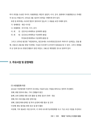 332 |333%uc81c6%uc7a5 %u300c%uc219%uc6b0%ud68c%u300d%uc758 %ucc3d%ub9bd%uacfc %ud65c%ub3d9%ubc15%uc0ac %uacfc%uc815%uc744 %uc218%ub8cc%ud55c %uc790%uc774%ub2e4. %ud2b9%ubcc4%ud68c%uc6d0%uc740 %uc7ac%ub2e8%uc758 %uc124%ub9bd%uc790, %uc774%uc0ac, %uac10%uc0ac, %ucd1d%ud68c%uc5d0%uc11c %ud2b9%ubcc4%ud68c%uc6d0%uc73c%ub85c %ucd94%ub300%ud55c %uc790 %ub4f1%uc73c%ub85c %ud558%uc600%uc73c%uba70, 1976%ub144 3%uc6d4 1%uc77c%ubd80%ud130 %ud68c%uce59%uc744 %uc2dc%ud589%ud558%uac8c %ub418%uc5b4 %uc788%ub2e4.%ub610%ud55c %ub3d9 %ud68c%uce59%uc5d0%ub294 %uc219%uc6b0%ud68c %uba85%ub2e8%uc774 %ucca8%ubd80%ub418%uc5b4 %uc788%ub294%ubc14 %uadf8 %ub0b4%uc6a9%uc744 %ubcf4%uba74 %uc544%ub798%uc640 %uac19%ub2e4.%uac00. %uba85%uc608%ud68c%uc7a5 : %uc7ac%ub2e8 %uc774%uc0ac%uc7a5%ub098. %ud2b9%ubcc4%ud68c%uc6d0 : %ubd80%uc774%uc0ac%uc7a5, %uc774%uc0ac, %uac10%uc0ac%ub2e4. %ud68c %uc7a5 : %uae40%ub9cc%uc2dd(%uace0%ub824%ub300%ud559%uad50 %uc0c1%uacfc%ub300%ud559 %uc878%uc5c5)%ub77c. %ud68c %uc6d0 : %uae40%uc9c4%uaddc(%uace0%ub824%ub300%ud559%uad50 %uc774%uacf5%ub300%ud559 %uc878%uc5c5) %ubc15%uacbd%ud638(%uc5f0%uc138%ub300%ud559%uad50 %uc774%uacf5%ub300%ud559 %uc878%uc5c5) %ub4f1%uadf8%ub9ac%uace0 1979%ub144 %ubc1c%uac04%ud55c %u300c%uc0c8%uac15%uc6d0%uc758%uc219%u300d %ucc3d%uac04%ud638%uc5d0%ub3c4 %uc219%uc6b0%ud68c%uc7a5(%uae40%uc9c4%uaddc)%uc758 %uaca9%ub824%uc0ac%uac00 %uc2e4%ub824%uc788%ub294 %uac83%uc744 %ubcfc %ub54c, 1981%ub144 4%uc6d4 8%uc77c %ucc3d%ub9bd %uc774%uc804%uc5d0%ub3c4 %uc0ac%uc2e4%uc0c1 %uc219%uc6b0%ud68c%uac00 %uc870%uc9c1%ub418%uc5b4 %uc788%uc5c8%uc74c%uc744 %uc54c %uc218 %uc788%ub2e4. %uadf8%ub7ec%ub098 %ud68c%uc6d0%ub4e4%uc758 %uad70 %uc785%ub300 %ub4f1%uc73c%ub85c %ud55c%ub3d9%uc548 %ud65c%ub3d9%uc774 %uc911%ub2e8 %ub418%uc5c8%uace0, 1981%ub144 %uc7ac%ucc3d%ub9bd%ud55c %uac83%uc73c%ub85c %uc54c%ub824%uc838 %uc788%ub2e4(1) %uc0ac%ub2e8%ubc95%uc778%ud654 %uc774%uc8042016%ub144 %uc0ac%ub2e8%ubc95%uc778%ud654 %uc774%uc804%uae4c%uc9c0 %uc219%uc6b0%ud68c%ub294 %ub2e4%uc74c%uacfc %uac19%uc740 %uc0ac%uc5c5%uc744 %ud68c%uce59%uc73c%ub85c %uc815%ud558%uc5ec %ucd94%uc9c4%ud588%ub2e4.%uccab%uc9f8, %ud68c%uc6d0 %uba85%ubd80%uc640 %ud68c%ubcf4, %uae30%ud0c0 %uac04%ud589%ubb3c%uc758 %ubc1c%uac04%ub458%uc9f8, %uc720%ub300 %uac15%ud654%ub97c %uc704%ud55c %uce5c%ubaa9 %ud65c%ub3d9 %ubc0f %ud68c%uc6d0 %uacbd%uc870%uc0ac %ucd95%ud558 %u302e %uc704%ub85c%uc14b%uc9f8, %ud559%uc0ac %uc7ac%uc0ac%uc0dd%uc744 %uc704%ud55c %uc7a5%ud559%uc0ac%uc5c5%ub137%uc9f8, %uac15%uc6d0%uc778%uc7ac%uc721%uc131%uc7ac%ub2e8 %ubc0f %ud559%uc0ac %uc6b4%uc601%uc5d0 %ub300%ud55c %ud611%uc870 %ubc0f %uac74%uc758%ub2e4%uc12f%uc9f8, %ud5a5%ud1a0 %ubc1c%uc804%uc744 %uc704%ud55c %ucc2c%uc870 %ubc0f %ubd09%uc0ac %ud65c%ub3d9%uc5ec%uc12f%uc9f8, %uae30%ud0c0 %ud544%uc694%ud55c %uc0ac%uc5c5 %ub4f1%uc774%uba70, %uc774 %uc678%uc5d0 %uc219%uc6b0%ud68c%uae30%uae08%uc704%uc6d0%ud68c%ub97c %ub450%uace0 %uae30%uae08 %uc870%uc131 %uc0ac%uc5c5%uc744 %ucd94%uc9c4%ud558%uace03. %uc8fc%uc694%uc0ac%uc5c5 %ubc0f %uc6b4%uc601%uc7ac%uc6d0