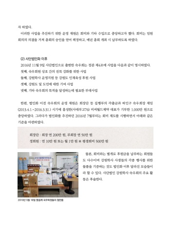 %uc790 %ud558%uc600%ub2e4. %uc774%ub7ec%ud55c %uc0ac%uc5c5%uc744 %ucd94%uc9c4%ud558%uae30 %uc704%ud55c %uc6b4%uc601 %uc7ac%uc6d0%uc740 %ud68c%ube44%uc640 %uae30%ud0c0 %uc218%uc785%uc73c%ub85c %ucda9%ub2f9%ud558%uace0%uc790 %ud588%ub2e4. %ud68c%ube44%ub294 %uc784%uc6d0 %ud68c%uc758%uc758 %uc758%uacb0%uc744 %uac70%uccd0 %ucd1d%ud68c%uc758 %uc2b9%uc778%uc744 %uc5bb%uc5b4 %ucc45%uc815%ud558%uace0, %ub9e4%ub144 %ucd1d%ud68c %uac1c%ucd5c %uc2dc %ub0a9%ubd80%ud558%ub3c4%ub85d %ud558%uc600%ub2e4.(2) %uc0ac%ub2e8%ubc95%uc778%ud654 %uc774%ud6c42016%ub144 11%uc6d4 9%uc77c %uc0ac%ub2e8%ubc95%uc778%uc73c%ub85c %ucd9c%ubc94%ud55c %uc219%uc6b0%ud68c%ub294 %uc815%uad00 %uc81c4%uc870%uc5d0 %uc0ac%uc5c5%uc744 %ub2e4%uc74c%uacfc %uac19%uc774 %uba85%uc2dc%ud558%uc600%ub2e4.%uccab%uc9f8, %uc219%uc6b0%ud68c%uc6d0 %uc0c1%ud638 %uac04%uc758 %uce5c%ubaa9 %uac15%ud654%ub97c %uc704%ud55c %uc0ac%uc5c5%ub458%uc9f8, %uac15%uc6d0%ud559%uc0ac %uc6b4%uc601%uc9c0%uc6d0 %ub4f1 %uac15%uc6d0%ub3c4 %uc778%uc7ac%uc721%uc131 %ud6c4%uc6d0 %uc0ac%uc5c5%uc14b%uc9f8, %uac15%uc6d0%ub3c4 %ubc0f %ub3c4%ubbfc%uc5d0 %ub300%ud55c %uae30%uc5ec %uc0ac%uc5c5%ub137%uc9f8, %uae30%ud0c0 %uc219%uc6b0%ud68c%uc758 %ubaa9%uc801%uc744 %ub2ec%uc131%ud558%ub294%ub370 %ud544%uc694%ud55c %ubd80%ub300%uc0ac%uc5c5%ud55c%ud3b8, %ubc95%uc778%ud654 %uc774%uc804 %uc219%uc6b0%ud68c%uc758 %uc6b4%uc601 %uc7ac%uc6d0%uc740 %ud68c%uc7a5%ub2e8 %ub4f1 %uc9d1%ud589%ubd80%uc758 %uac39%ucd9c%uae08%uacfc %ud5c8%uc778%uad6c %uc219%uc6b0%ud68c%uc7a5 %uc7ac%uc784(2013.4.1.~2016.3.31.) %uc2dc%uae30%uc5d0 %ud64d%uc131%ud55c(%uc0ac%ub300%ubd80%uace076) %ube44%uc528%uc6d4%ub4dc%uc81c%uc57d %ub300%ud45c%uac00 %uae30%ubd80%ud55c 1,000%ub9cc %uc6d0%uc73c%ub85c %ucda9%ub2f9%ud558%uc600%ub2e4. %uadf8%ub7ec%ub2e4%uac00 %ubc95%uc778%ud654%ub97c %ucd94%uc9c4%ud558%ub358 2016%ub144 7%uc6d4%ubd80%ud130%ub294 %ud68c%ube44 %uc81c%ub3c4%ub97c %uc2dc%ud589%ud558%uba74%uc11c %uc544%ub798%uc640 %uac19%uc740 %uae30%uc900%uc744 %ub9c8%ub828%ud558%uc600%ub2e4.%ubb3c%ub860, %ud68c%ube44%uc640%ub294 %ubcc4%uac1c%ub85c %ud6c4%uc6d0%uae08%uc744 %ub0a9%ubd80%ud558%ub294 %ud68c%uc6d0%ub4e4%ub3c4 %ub2e4%uc218%uc774%uba70 %uac15%uc6d0%ud559%uc0ac %uc0ac%uc0dd%ub4e4%uc758 %uac01%uc885 %ud589%uc0ac%ub97c %uc704%ud55c %ubb3c%ud488%uc744 %uae30%uc99d%ud558%ub294 %uac83%ub3c4 %ubc95%uc778%ud654 %uc774%ud6c4 %ub2ec%ub77c%uc9c4 %ubaa8%uc2b5%ub4e4%uc774%ub77c %ud560 %uc218 %uc788%ub2e4. %uc0ac%ub2e8%ubc95%uc778 %uac15%uc6d0%ud559%uc0ac %uc219%uc6b0%ud68c%uc758 %uc8fc%uc694 %ud65c%ub3d9%uc740 %ud6c4%uc220%ud55c%ub2e4.%ud68c%uc7a5%ub2e8 : %ud68c%uc7a5 %uc5f0 200%ub9cc %uc6d0, %ubd80%ud68c%uc7a5 %uc5f0 50%ub9cc %uc6d0%uc815%ud68c%uc6d0 : %uc5f0 10%ub9cc %uc6d0 %ub610%ub294 %uc6d4 1%ub9cc %uc6d0 %u203b %ud3c9%uc0dd%ud68c%ube44 500%ub9cc %uc6d02019%ub144 5%uc6d4 18%uc77c %uc5f4%uc74c%uc81c %uc219%uc6b0%ud68c%uc6d0%ub4e4%uc758 %ud611%ucc2c%ud488